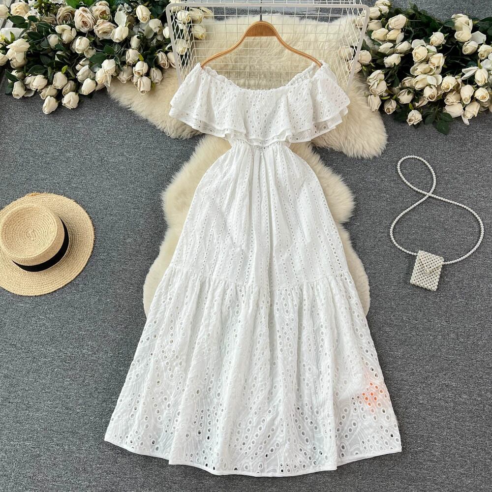 セクシーなワンネックドレスの女性のハイエンドフリルフレンチ刺繍中空アウトストラップレスウエストホリデードレス lyxaj85082490990
