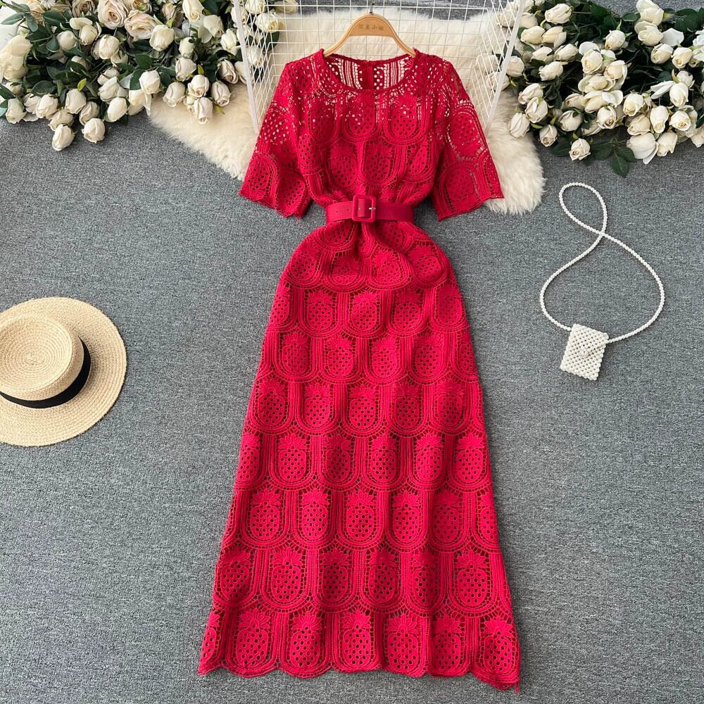 夏の新スタイル中空気質レディースファッションラウンドネック長袖レースドレス女性の半袖かぎ針編みウエストロングスカート サマー 夏物 Oネック lyxaj33469675175