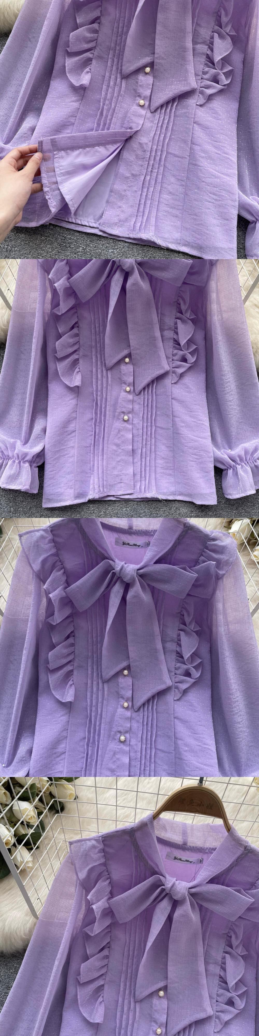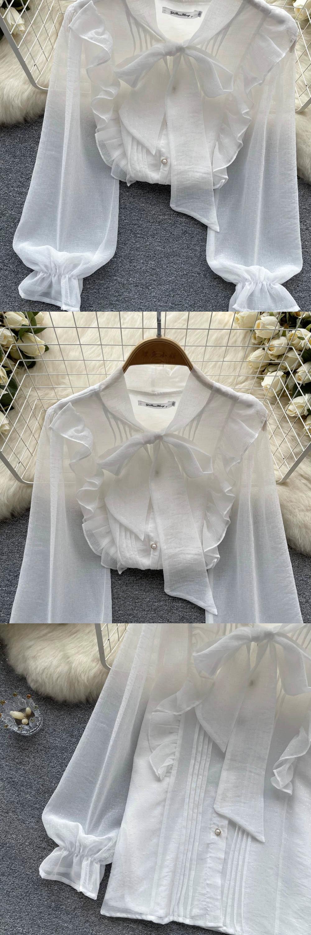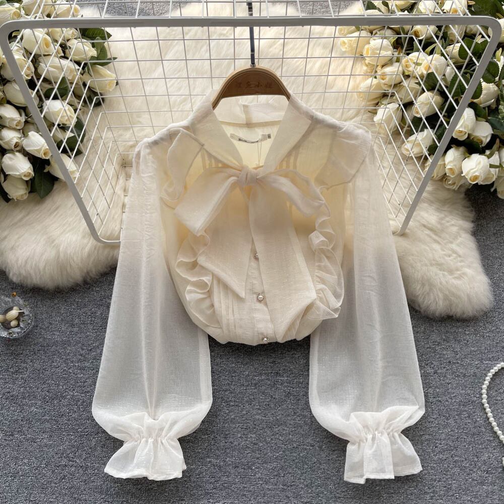 フレンチシフォンシャツレディース春ドレスファルバラセンス小さなリボンノットカラー長袖シックなトップトレンディ ロング スプリング 春物 lyxaj30716676153