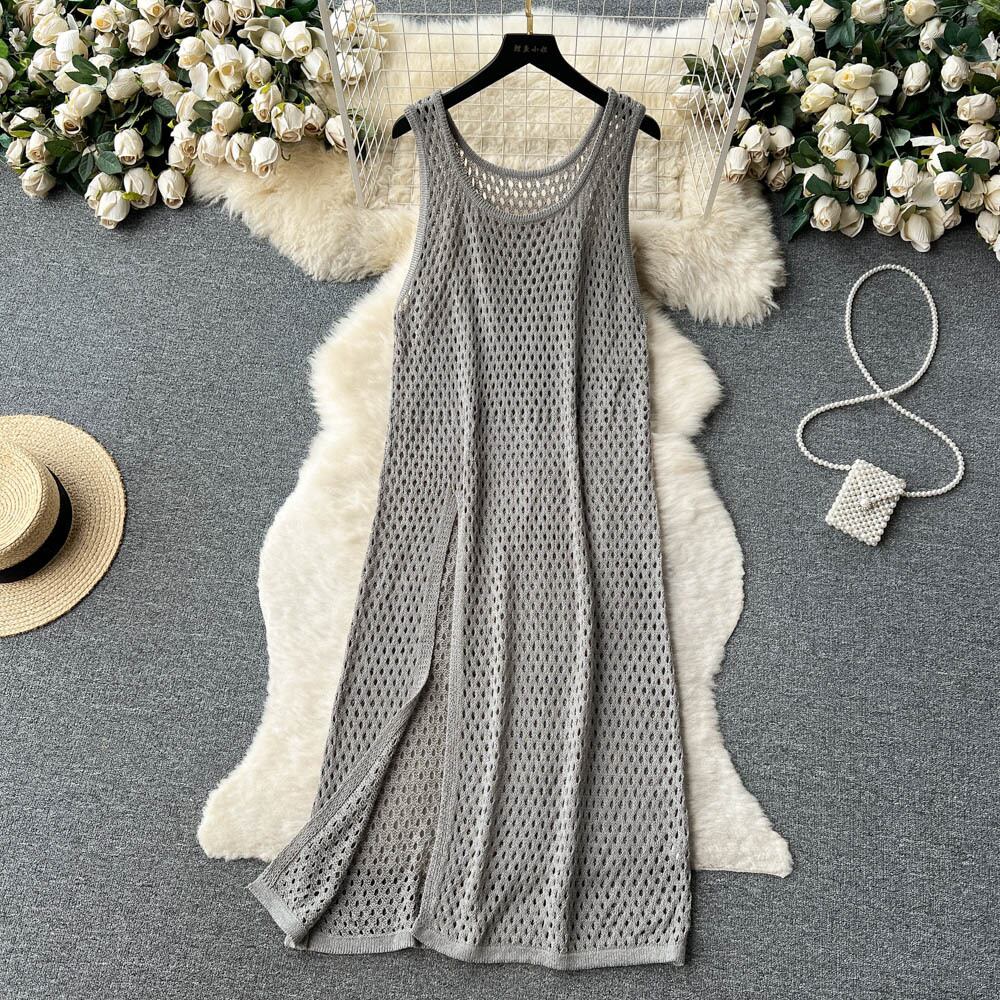 ニットベストドレスニッチ中空スリットアウターレイヤードオーバーシャツサマールーズロングドレス レッド 夏物 lyxaj73748432091