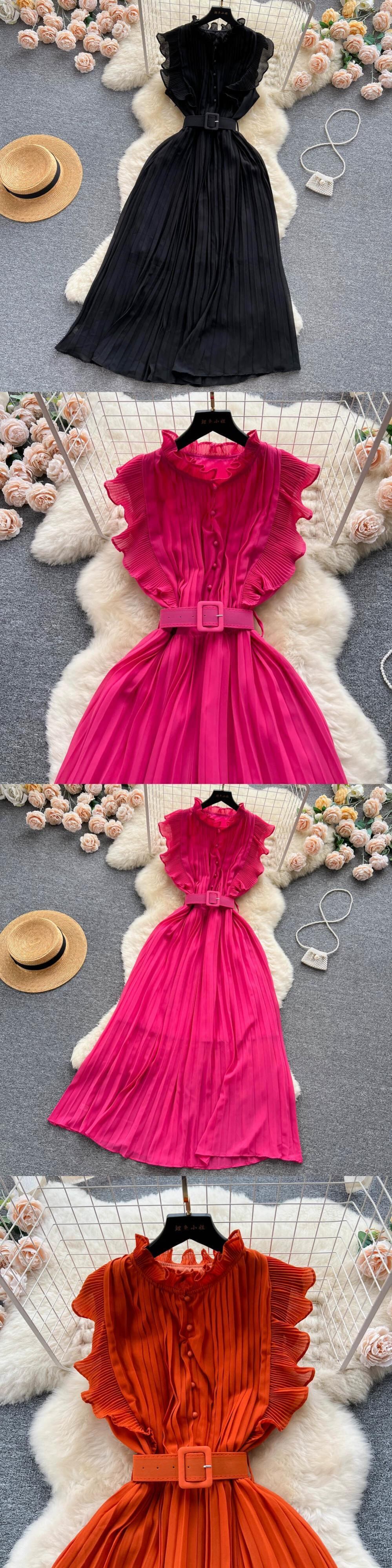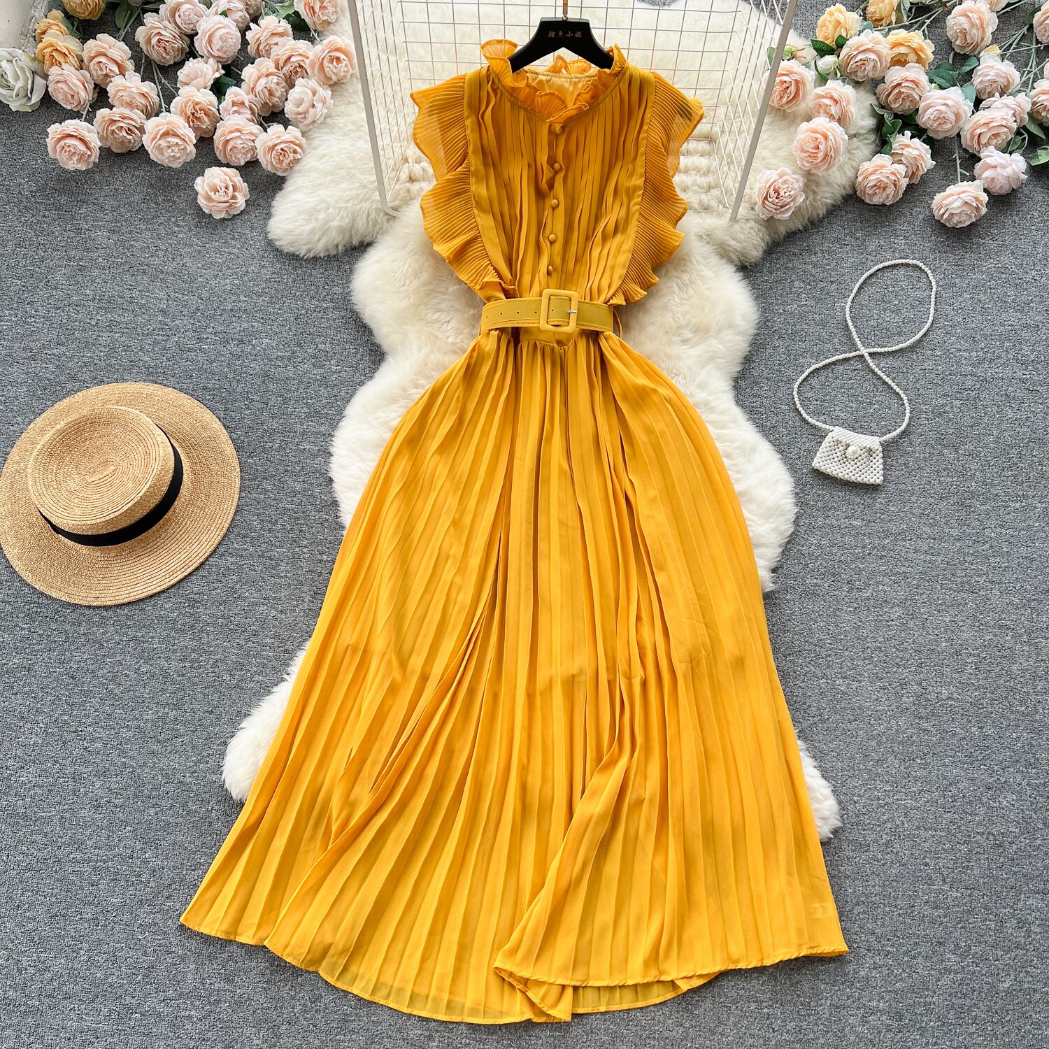 ベルト付きハイエンドニッチデザインシフォンロングスカート女性の夏のウエストフレンチヘップバーンスタイルの小さなフライングスリーブドレス サマー 夏物 ハーネス lyxaj89210893274