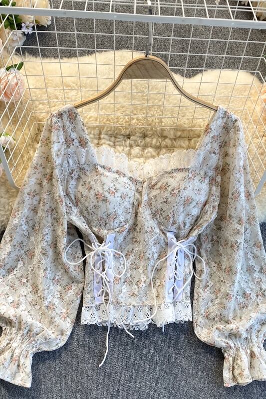 フレンチスイートレースレーススクエアカラーデザインセンスニッチストラップウエスト痩身ショートトップ女性の秋服 大人ガーリー スウィート キュート カジュアル オータム 秋物 スクウェア lyxaj43288299115