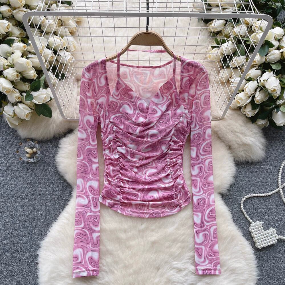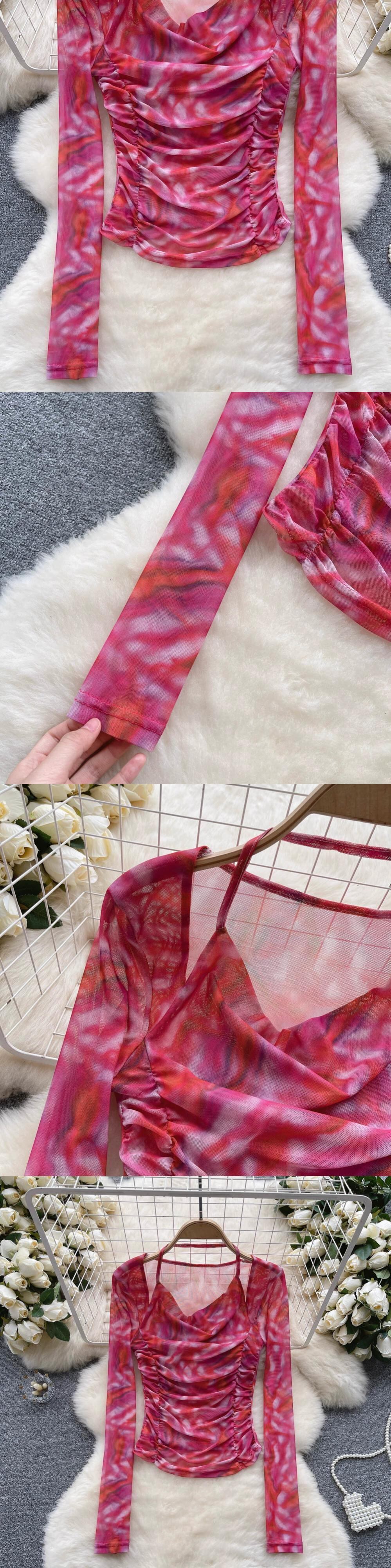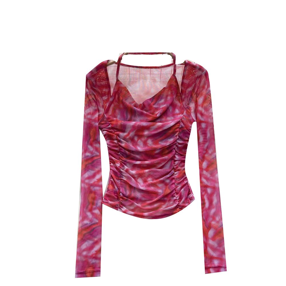 アメリカンレトロファッションシャーリングプリントブルーミングハンギングネック長袖Tシャツレディース薄肉スリムスリムメッシュガーゼ日焼け止めシャツ ロング lyxaj40847476064