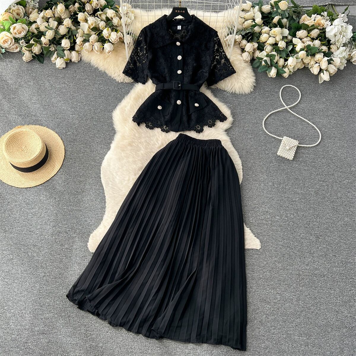 -end フレンチ スーツ レディース ファッション ラペル 半袖 ウエスト トップ + ハイウエスト プリーツ スカート ツーピース トレンド lyxaj24315607279