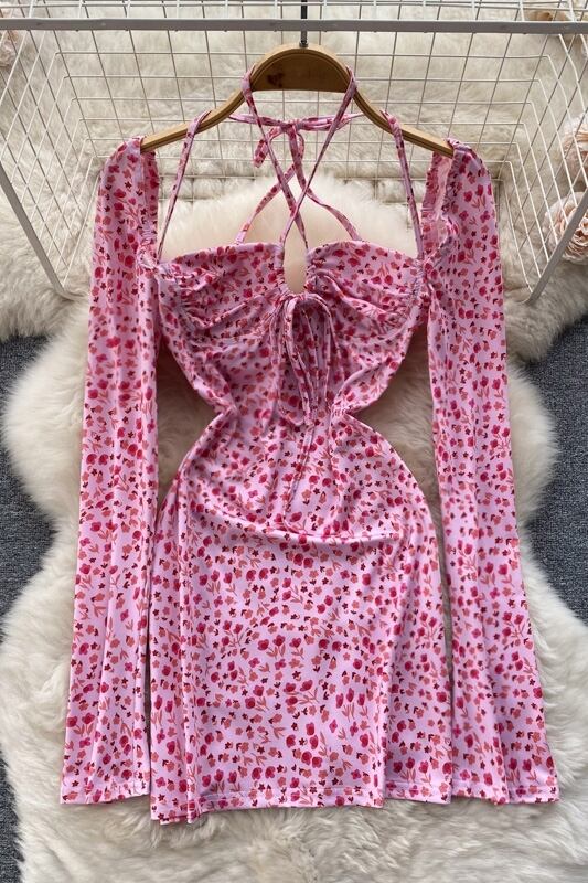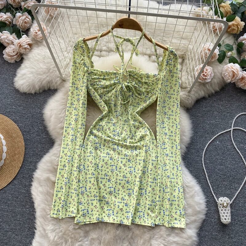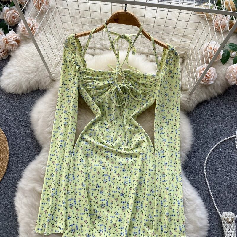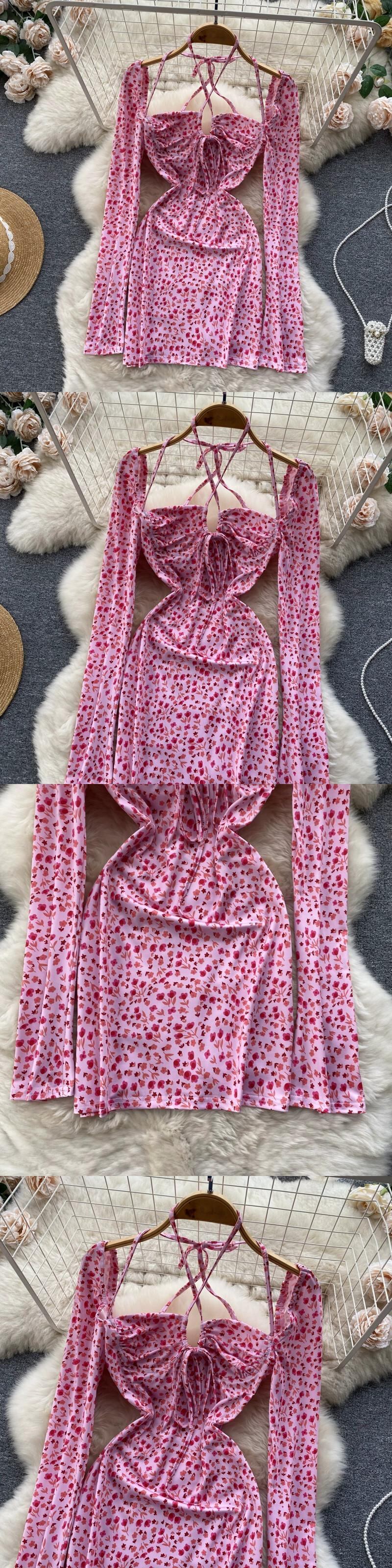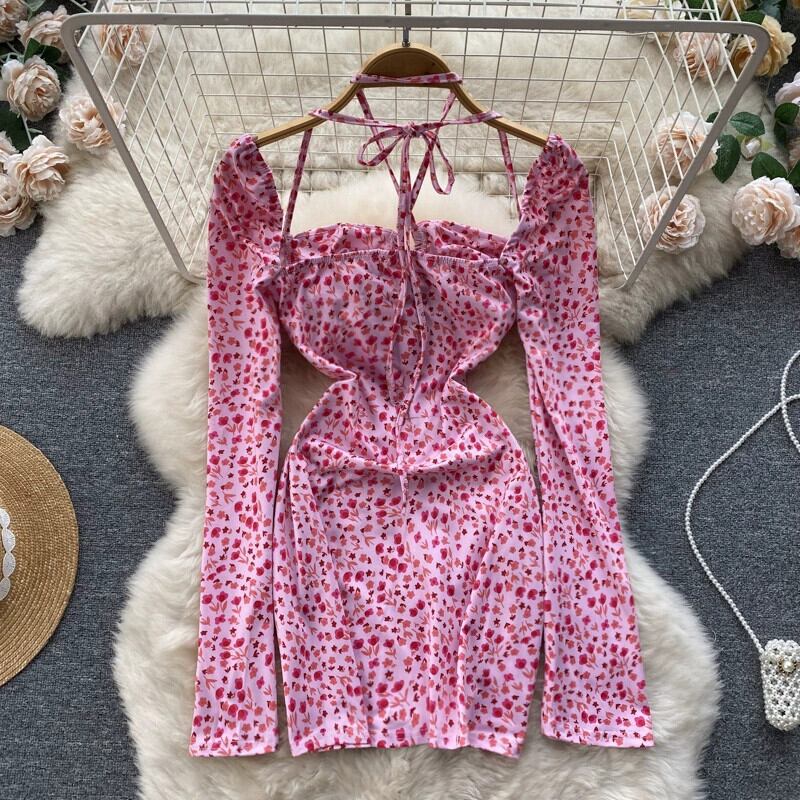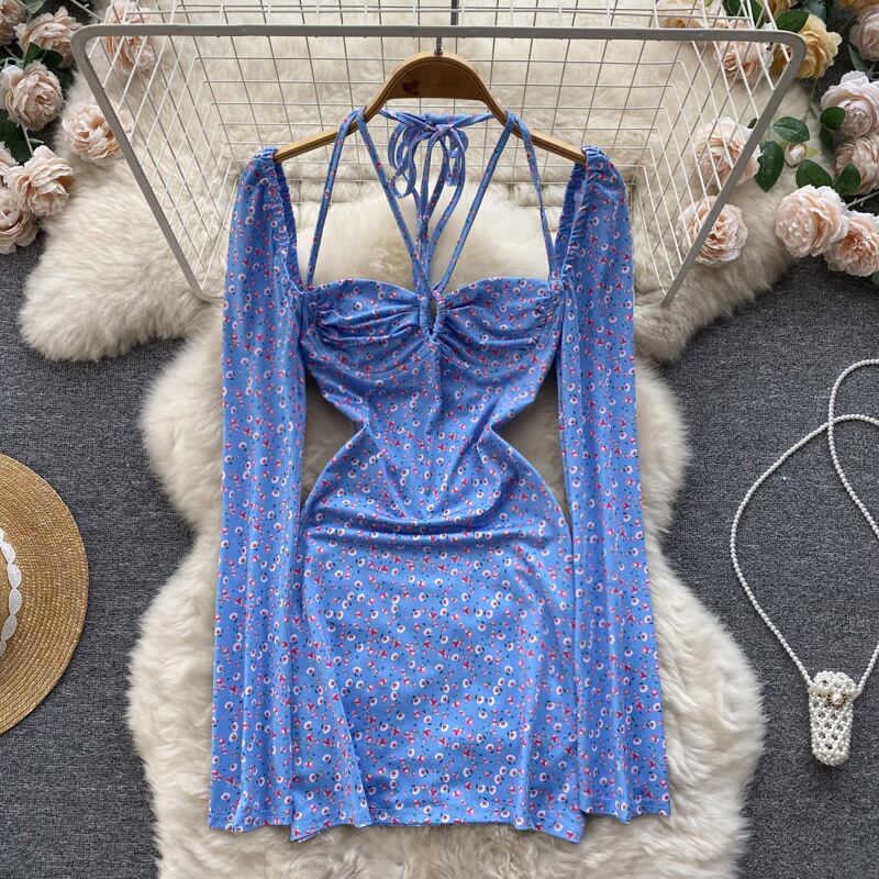 純粋な欲望風露鎖骨ぶら下げネックストラップ中空ドレス女性の春と秋の新しい花のセクシーなパッケージヒップスカート スプリング 春物 オータム 秋物 花柄 lyxaj30712710237