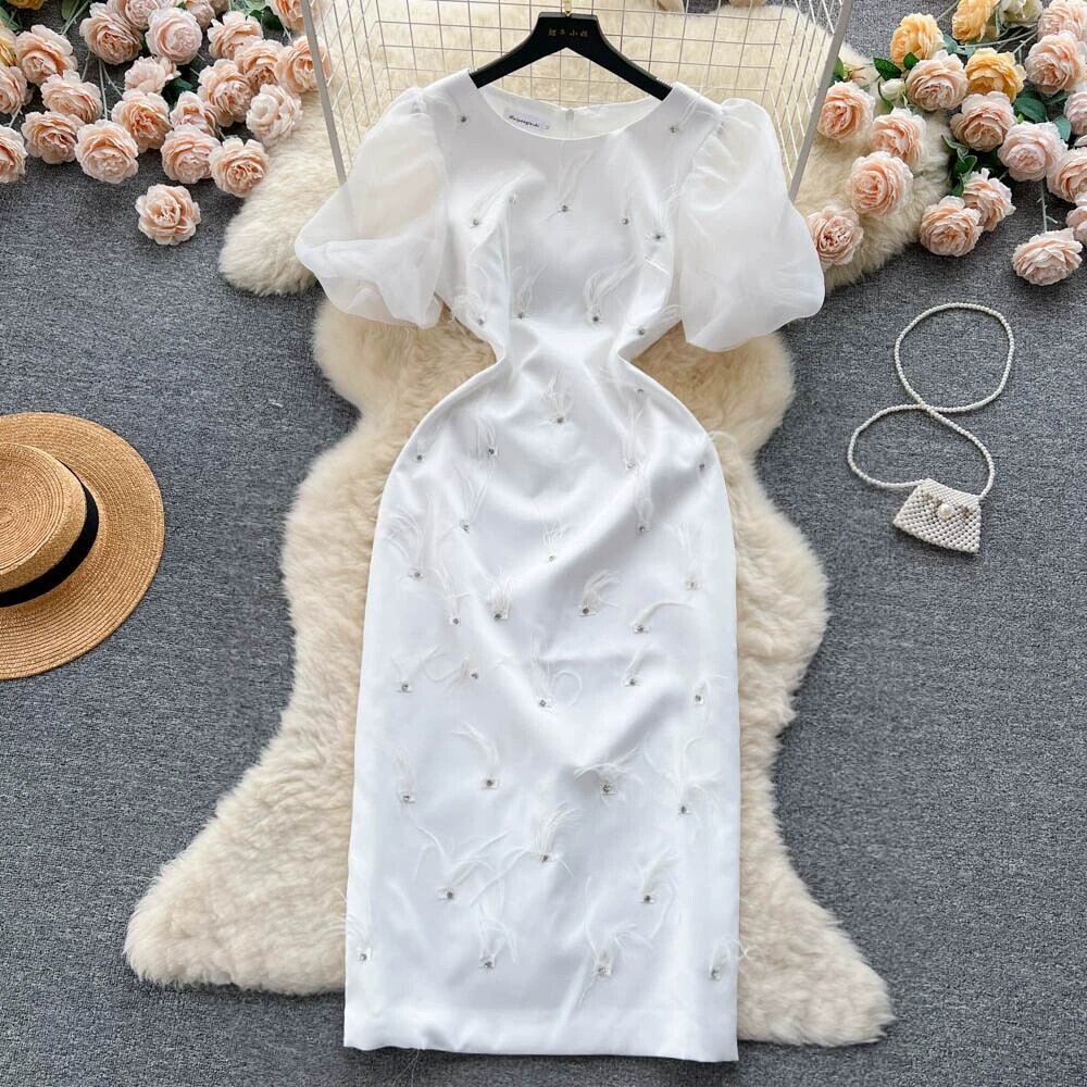 フレンチスタイルのハイエンド重工業ネイルドリルフェザーテルラウンドネックドレス女性スリム気質パフスリーブドレスロングスカート Oネック lyxaj44690302365