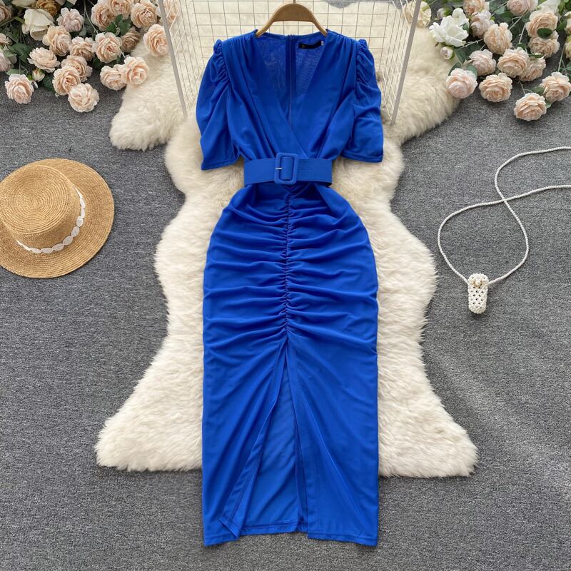 -エンドウエストライン痩身美しい半袖ドレス夏の女性の洋ナシ型フィギュア V ネックスリットバッグヒップスカート サマー 夏物 Vネック lyxaj87097039303