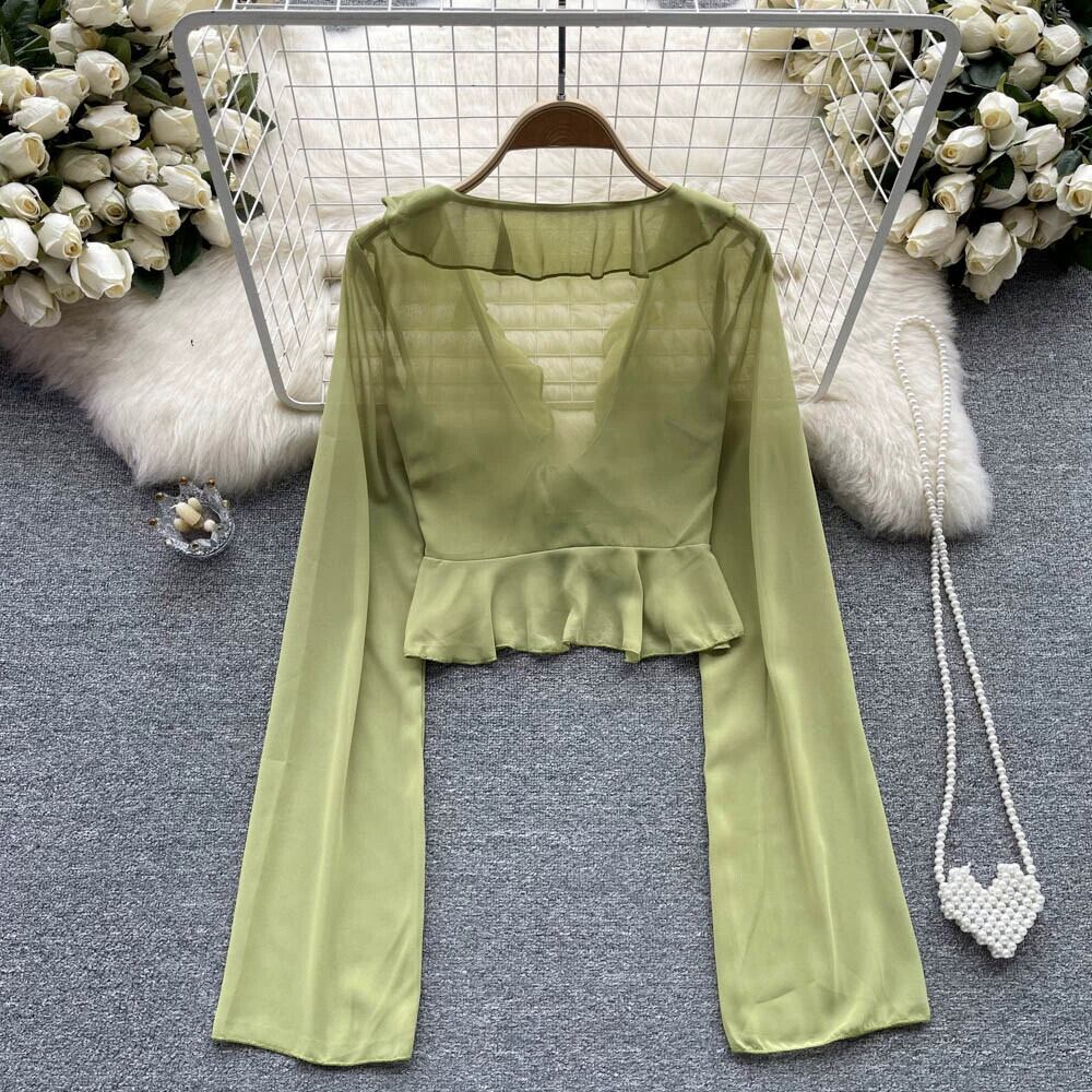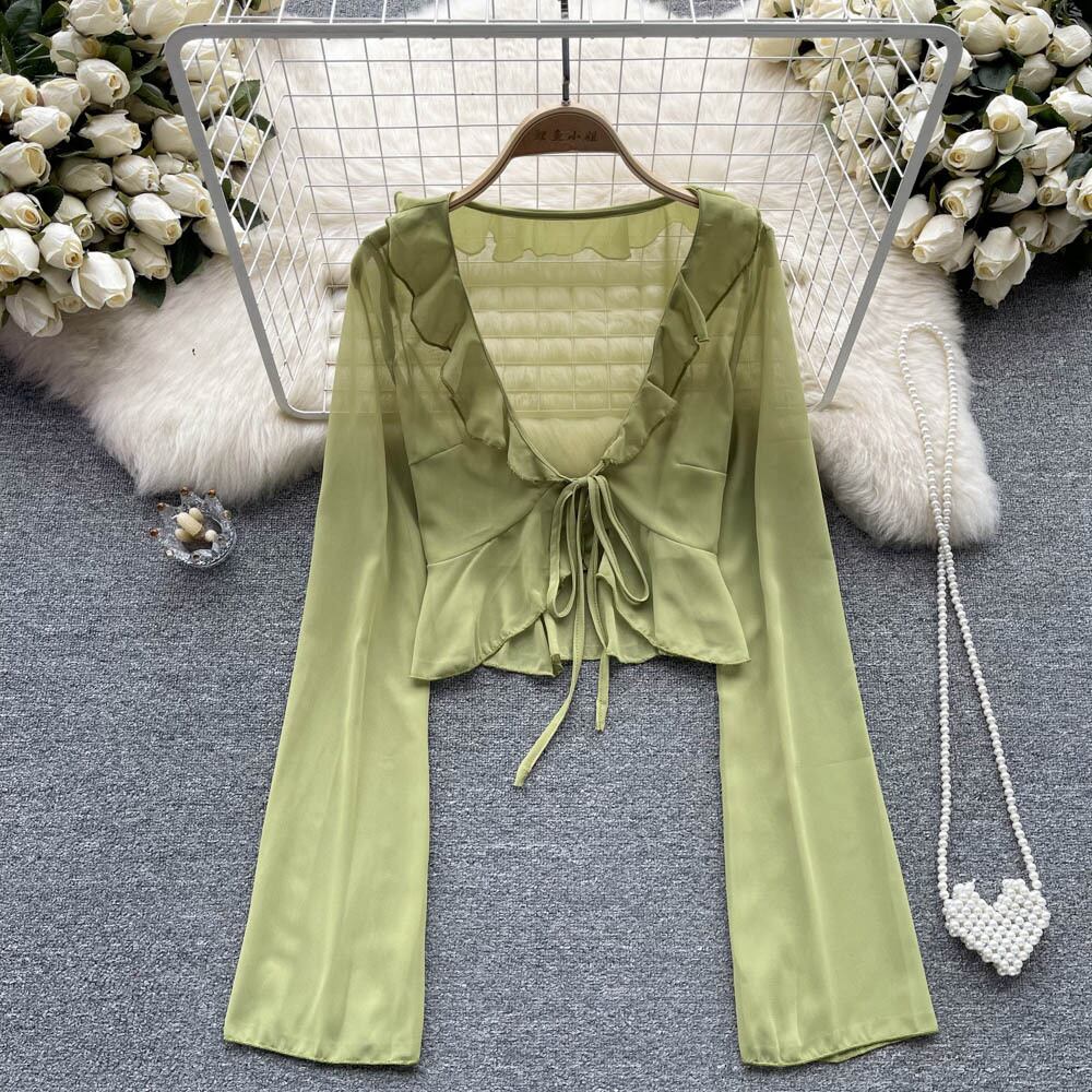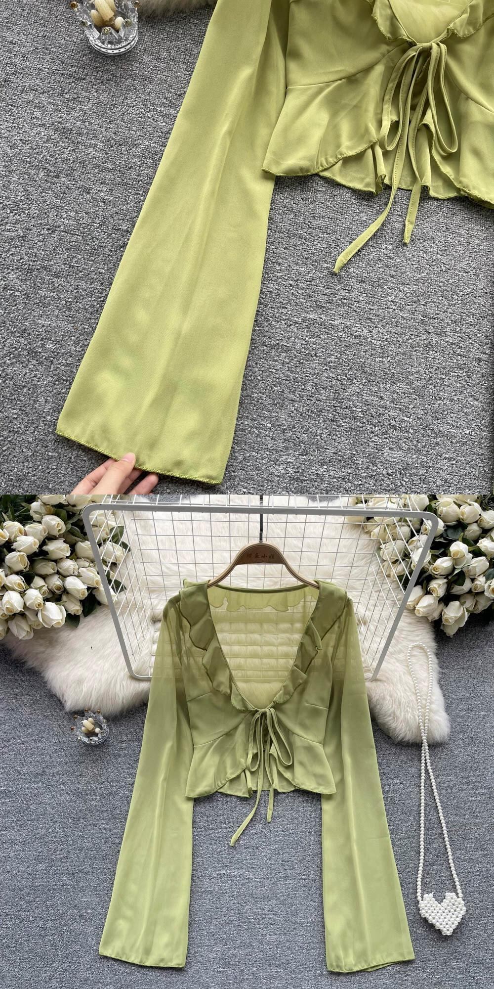 春と秋の新しいデザインセンス不規則なフリルVネック長袖Tシャツレディーススキーミングドローストリングショートシフォントップ ロング スプリング 春物 オータム 秋物 lyxaj59506564291