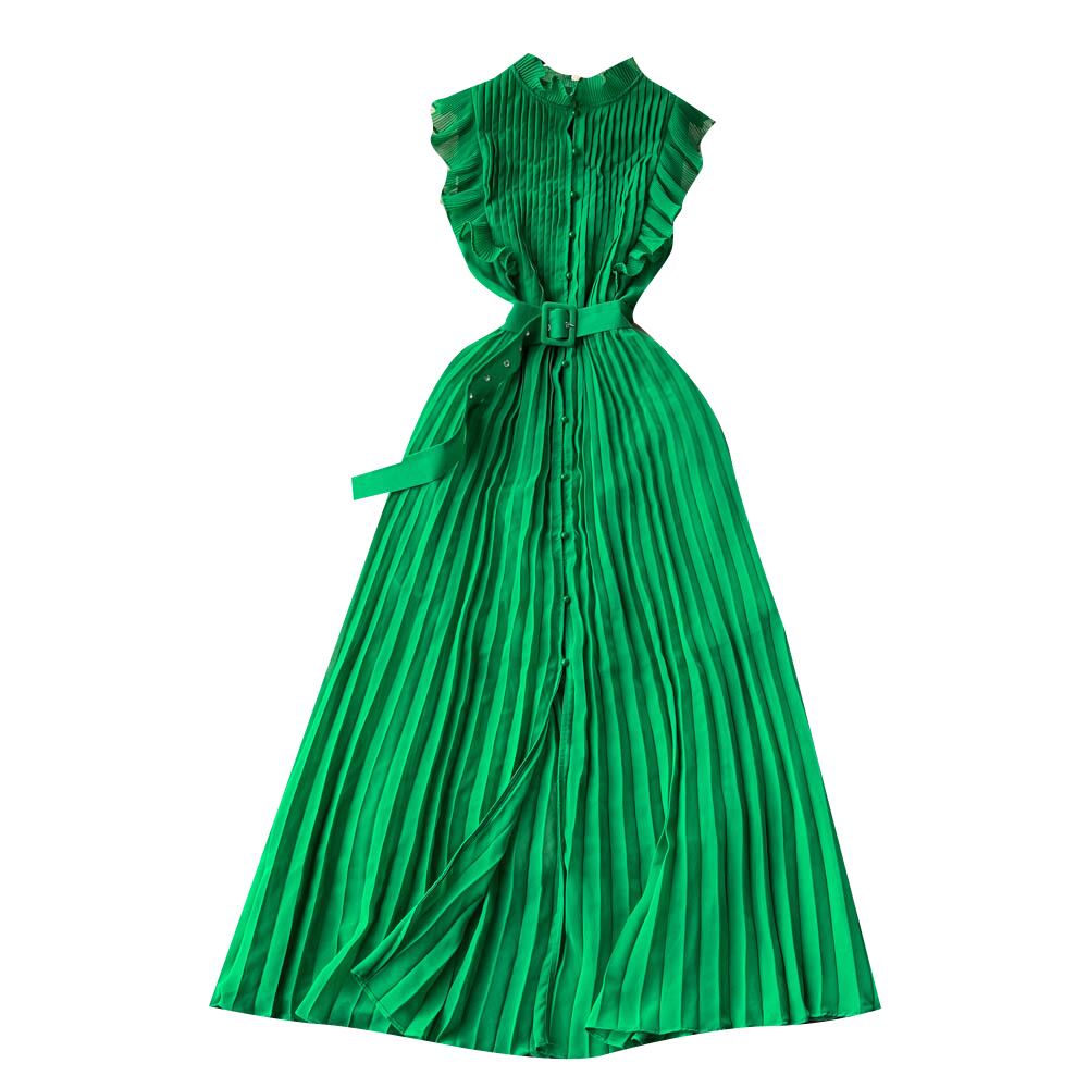 フレンチスーパーフェアリースモールフライングスリーブスタンドカラーシフォンドレス女性の夏のネクタイウエストビッグスイングシングルブレストプリーツロングスカート サマー 夏物 lyxaj84307314131