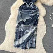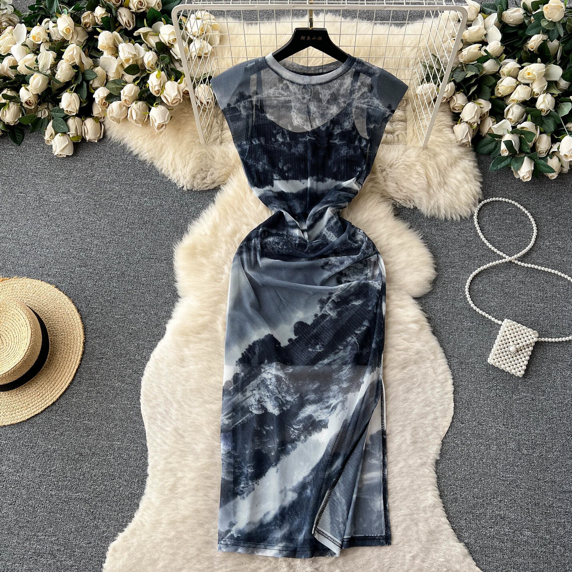 ヨーロッパとアメリカのスタイルのニッチブルーミングプリントラウンドネックドレス女性の夏のウエストウエスト気質スリットメッシュバッグヒップスカート サマー 夏物 Oネック ヨーロピアン lyxaj10886059802