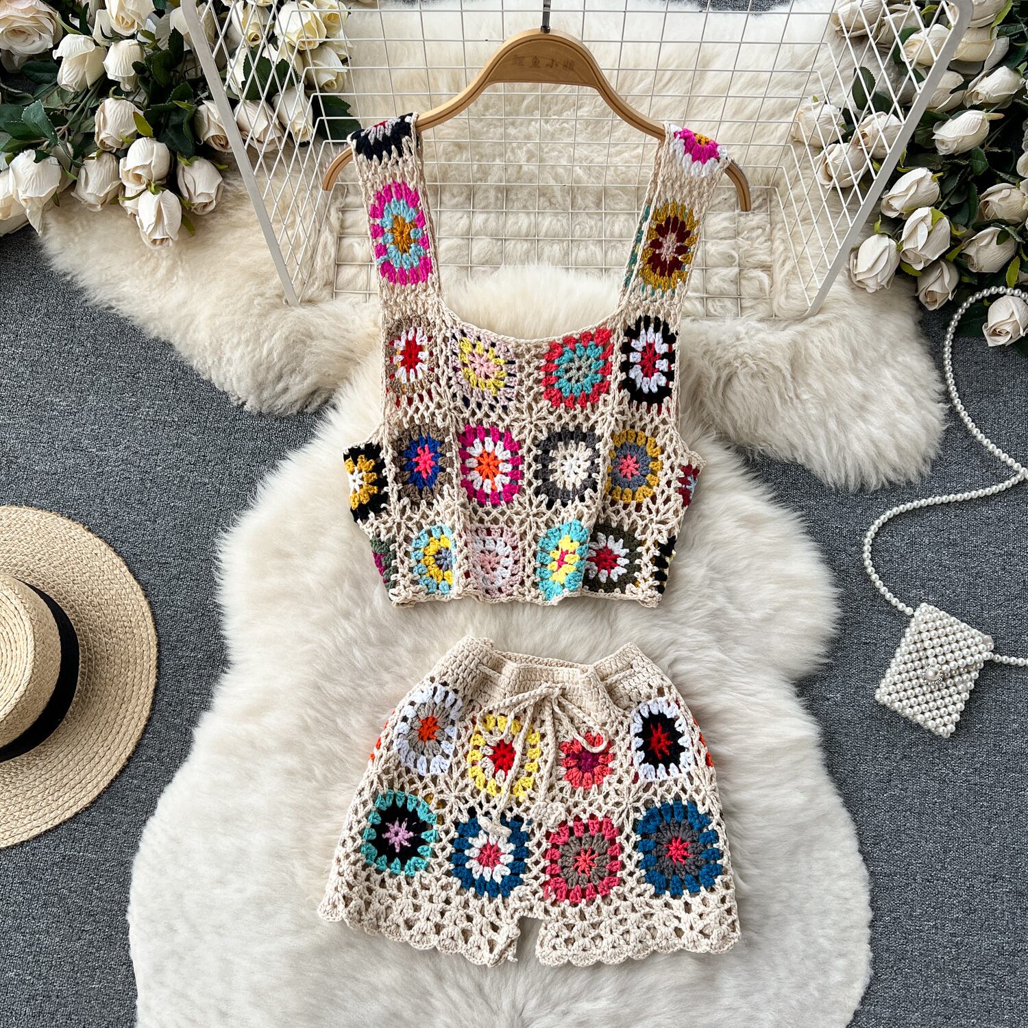 夏休みファッション中空スーツレディースかぎ針編みフラワーコントラストカラーキャミソール+ハイウエストワイドレッグショーツツーピーストレンディ ハイウェスト サマー 夏物 ブルマー ワイドパンツ フラワーデザイン lyxaj42692861664