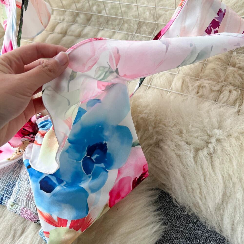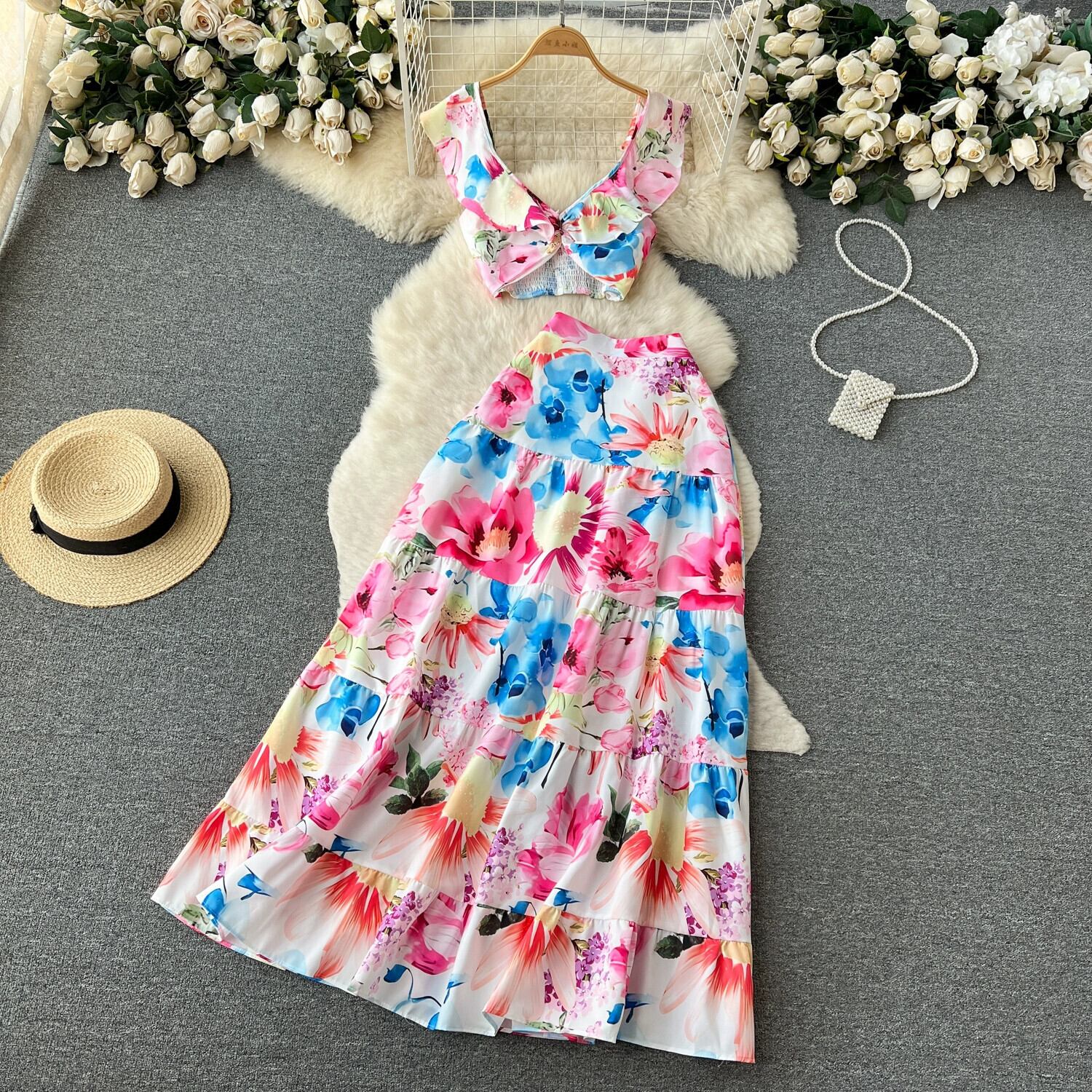 夏ボヘミアン花柄スーツ レディース ノースリーブ ショート サスペンダー トップ + ウエスト プリーツ スカート 2 点セット サマー 夏物 lyxaj19213110504