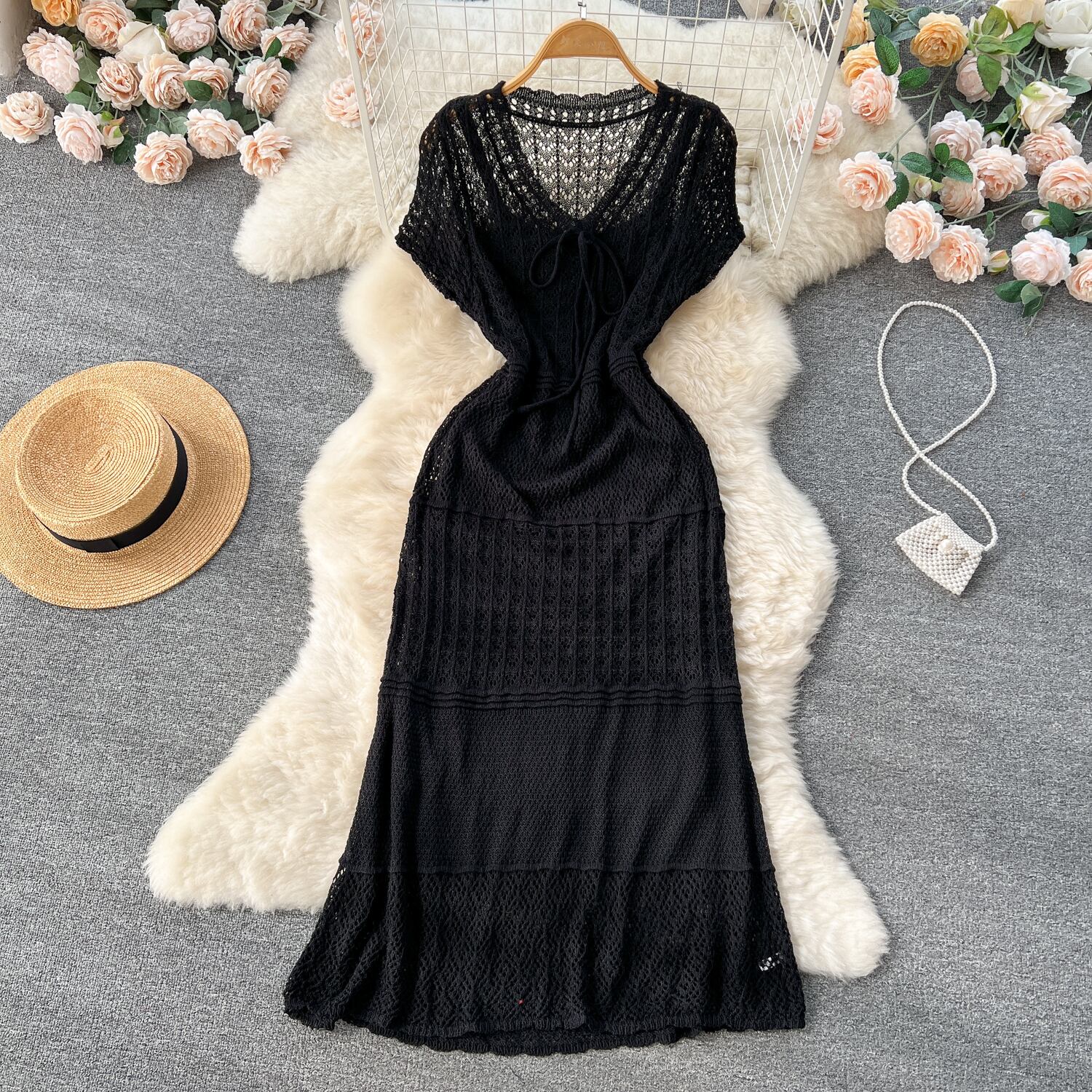 夏の新しい旅行ホリデースタイル半袖かぎ針編みドレス中空Vネックタイウエストスリムフィッシュテールドレス サマー 夏物 lyxaj21522073997