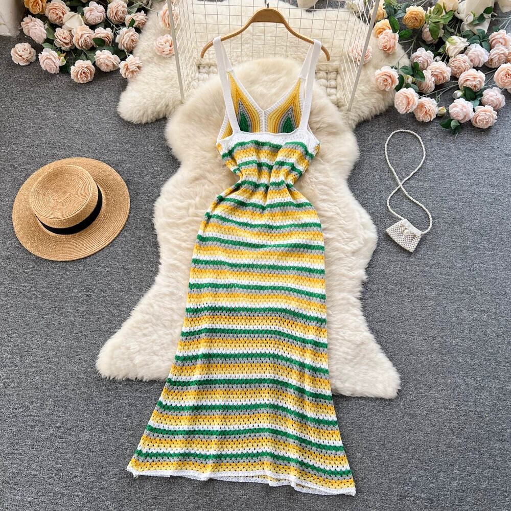 2023 夏ボヘミアンエスニックスタイルコントラストカラーストライプニットサスペンダードレス女性のバッグヒップマーメイドドレス サマー 夏物 lyxaj52839803125