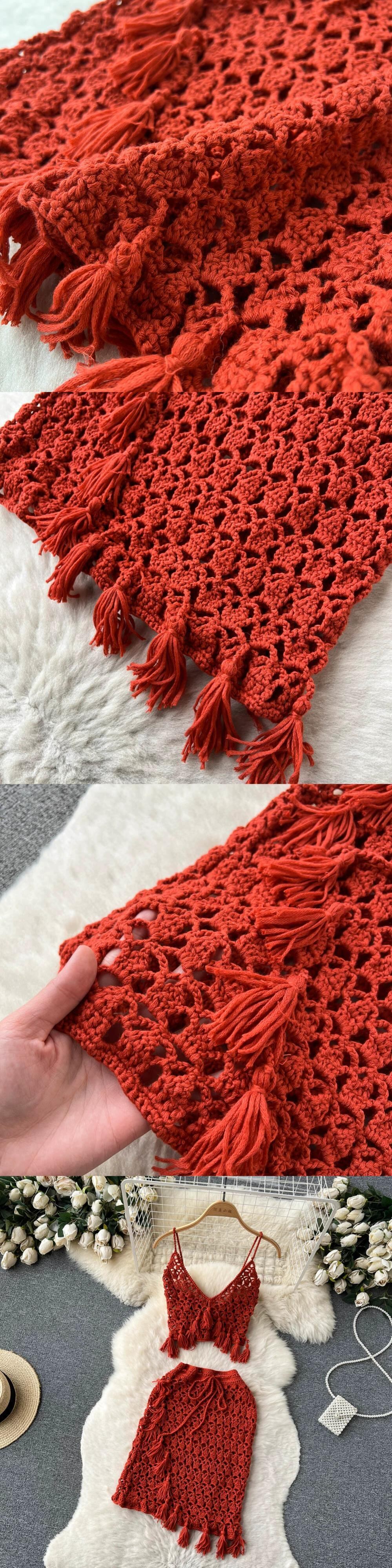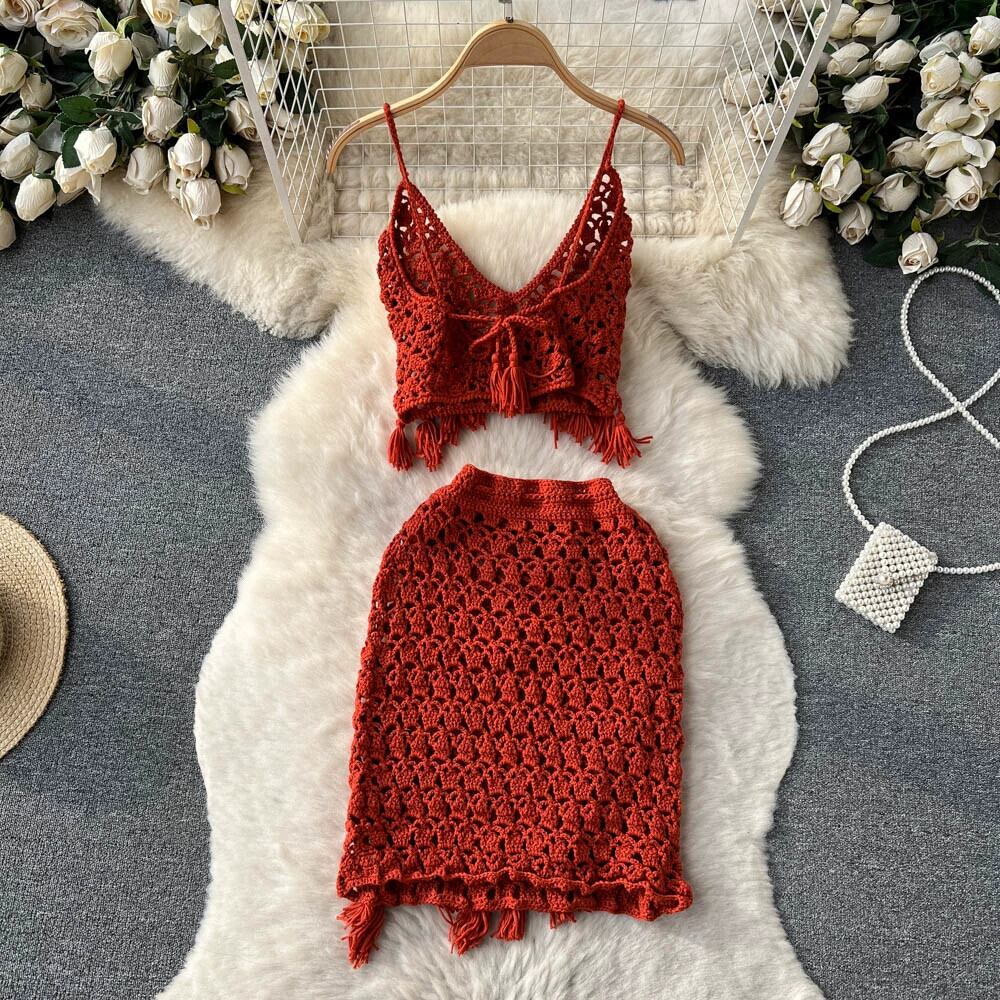 夏のボヘミアンホリデースタイル中空テルVネックチューブトップサスペンダートップ+ヒップスカートツーピーススーツトレンディ サマー 夏物 lyxaj62303045205