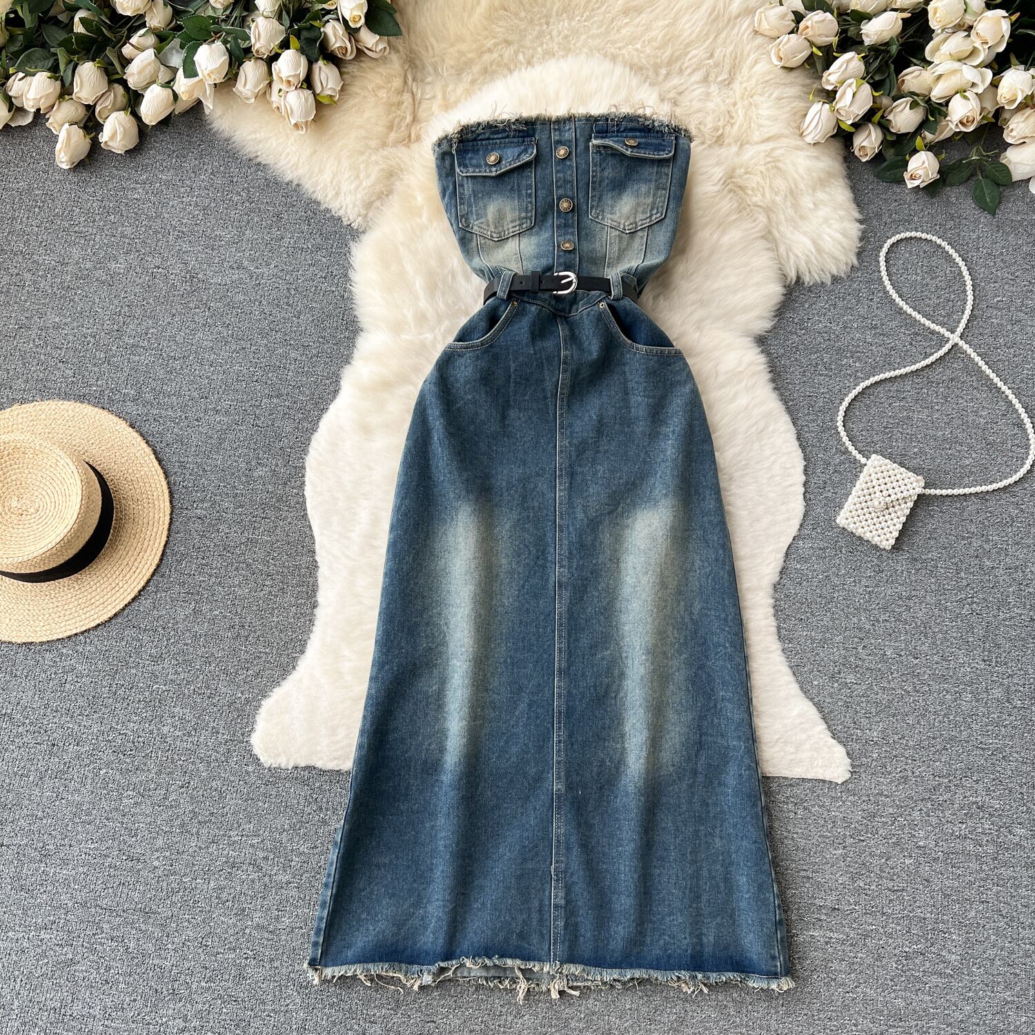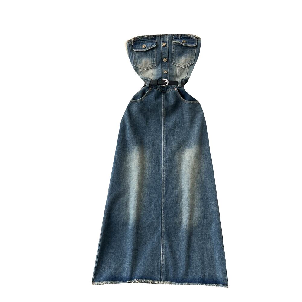 春夏デザインセンスチューブトップデニムドレス女性ウエスト痩身古い生エッジAラインレトロロングスカート スプリング 春物 サマー 夏物 lyxaj88809576896