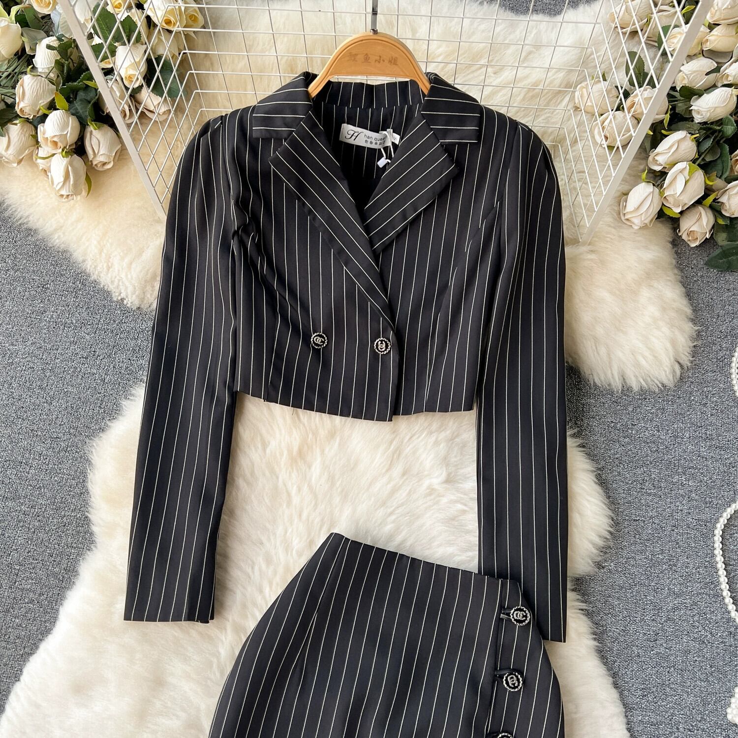春夏ストライプスーツ女性の修身気質ショートスーツ小さなジャケットスリットバッグヒップスカート2点セット スプリング 春物 サマー 夏物 lyxaj93791575837