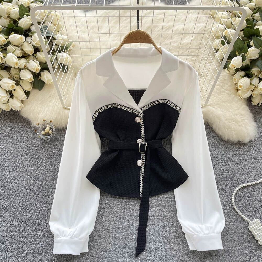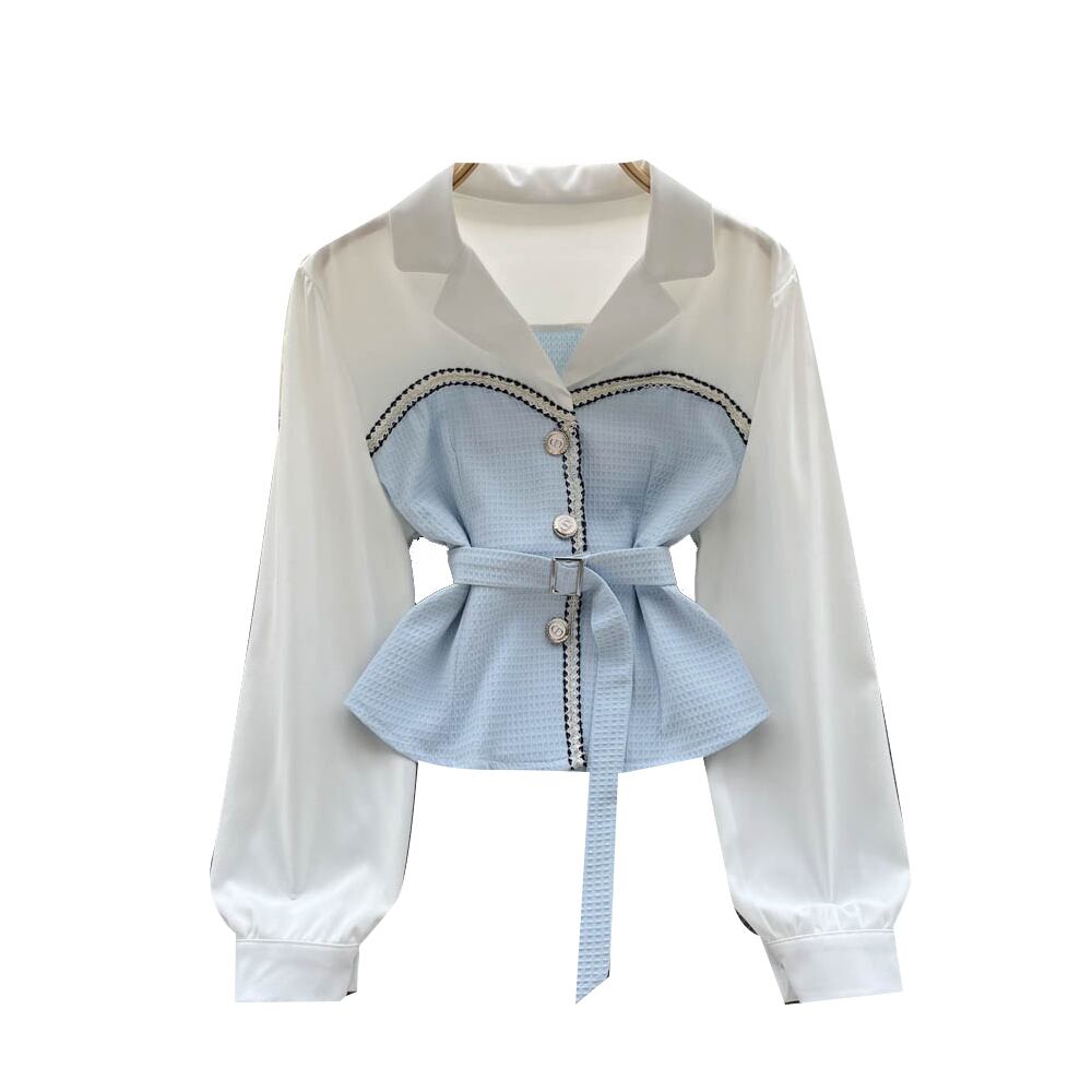 2023 春の新レトロ気質スリムウエストスプライシング偽ツーピースラペルショート長袖フレンチシャツ女性 ロング スプリング 春物 lyxaj70180061201