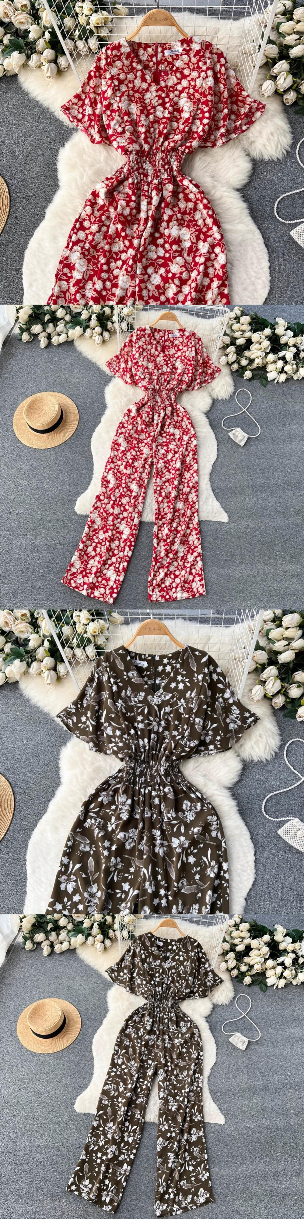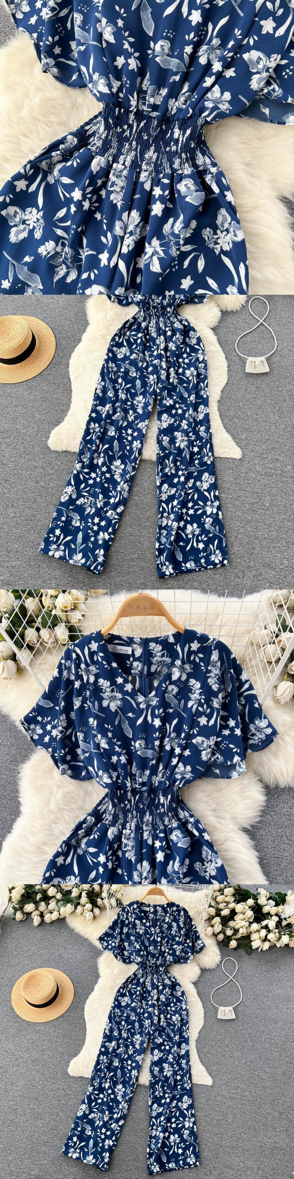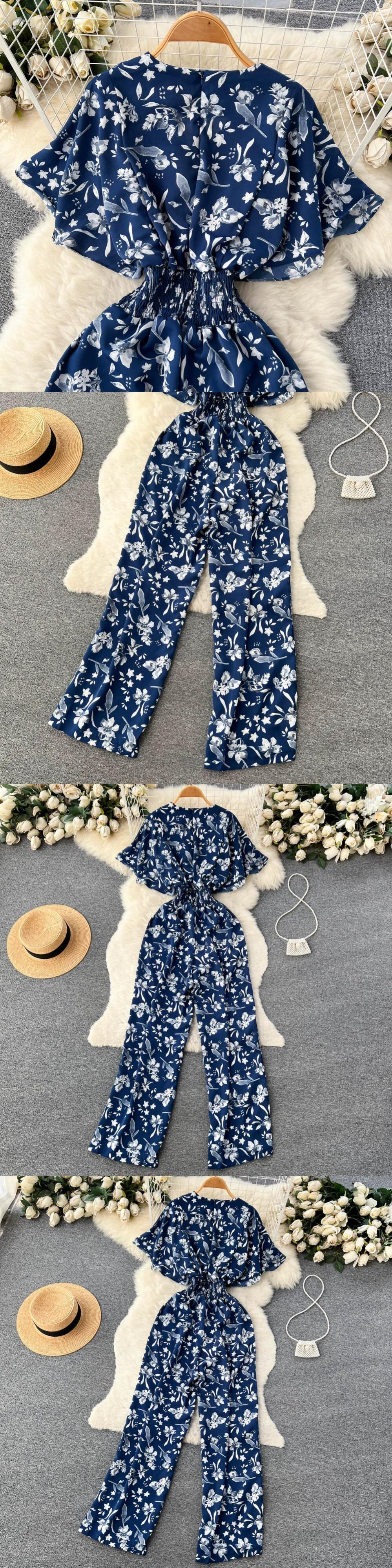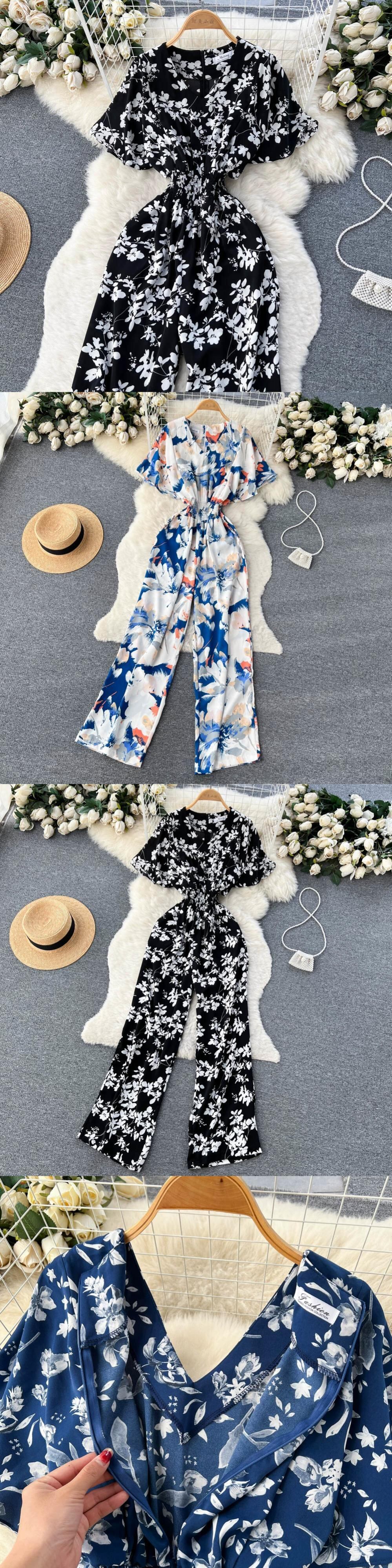 2023 夏の新ヨーロッパとアメリカの ins ファッション西洋スタイルネットレッド V ネックプリントスリムジャンプスーツ女性のワイドレッグパンツ サマー 夏物 Vネック ヨーロピアン lyxaj153763613