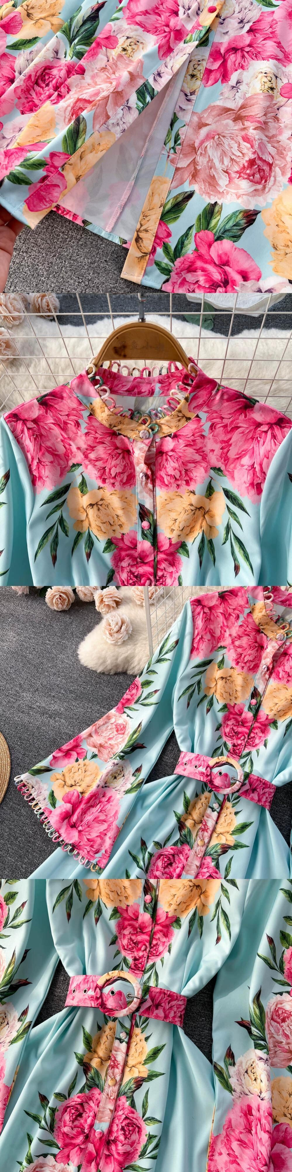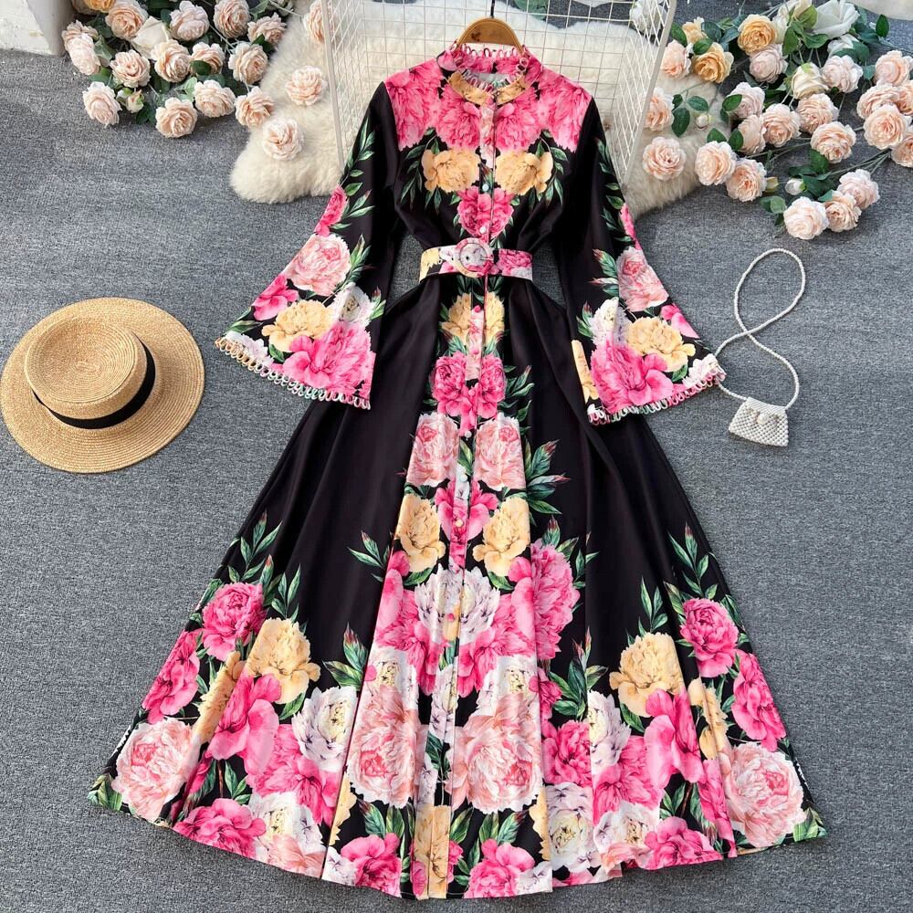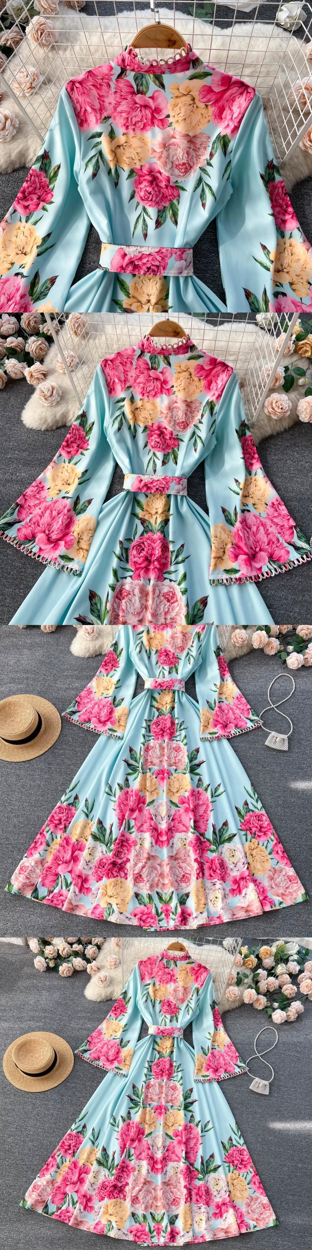 春と秋の新ヨーロッパとアメリカのインスタイルファッションパーソナリティプリントトランペットスリーブドレス女性の大きなスイング膝上 A ラインロングスカート潮 スプリング 春物 オータム 秋物 Aライン ヨーロピアン lyxaj72098783141