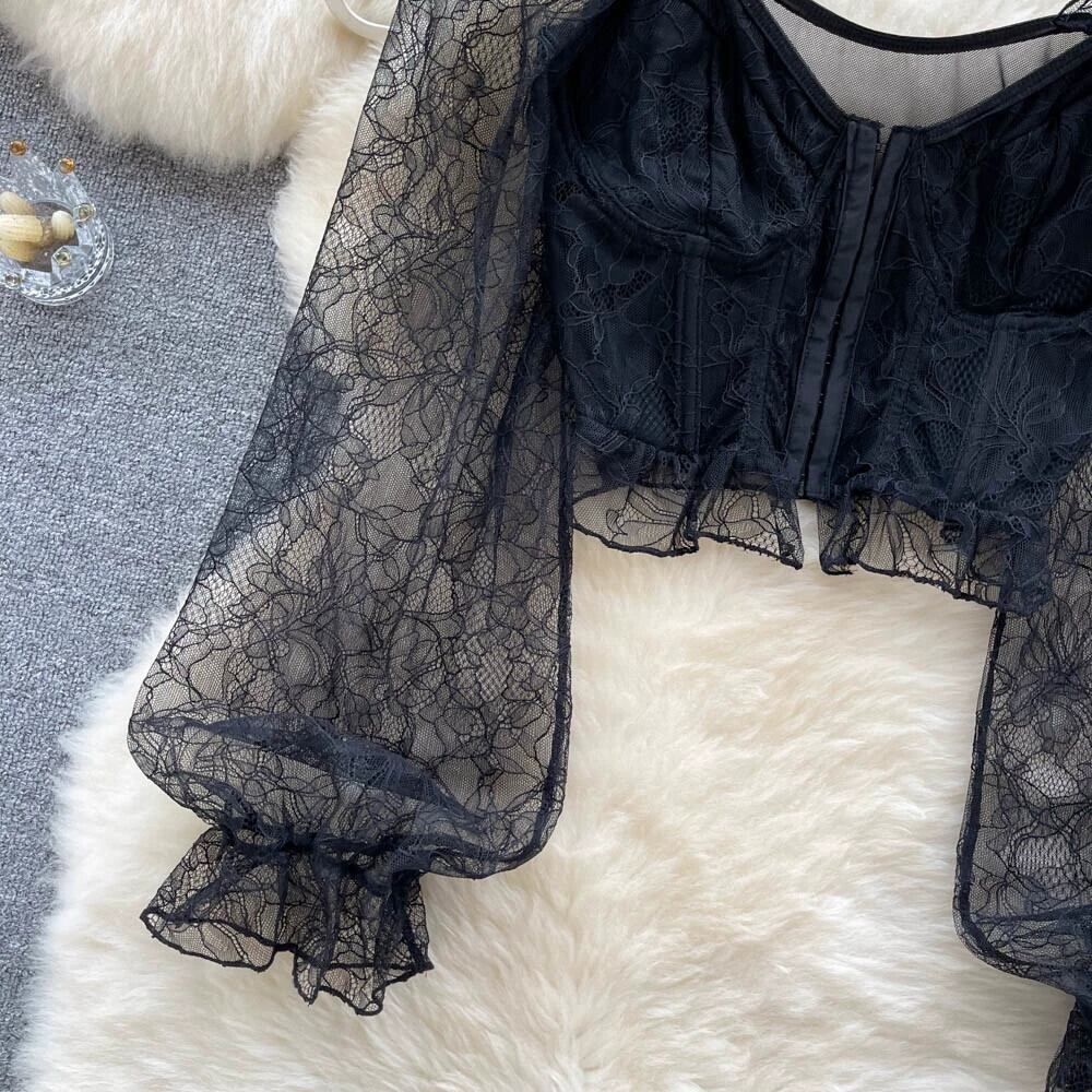 春と夏のセクシーなレースのボトリングシャツ女性のフランスのハイエンド透視ステッチメッシュスクエアカラーニッチシックトップ スプリング 春物 サマー 夏物 スクウェア lyxaj29328168606