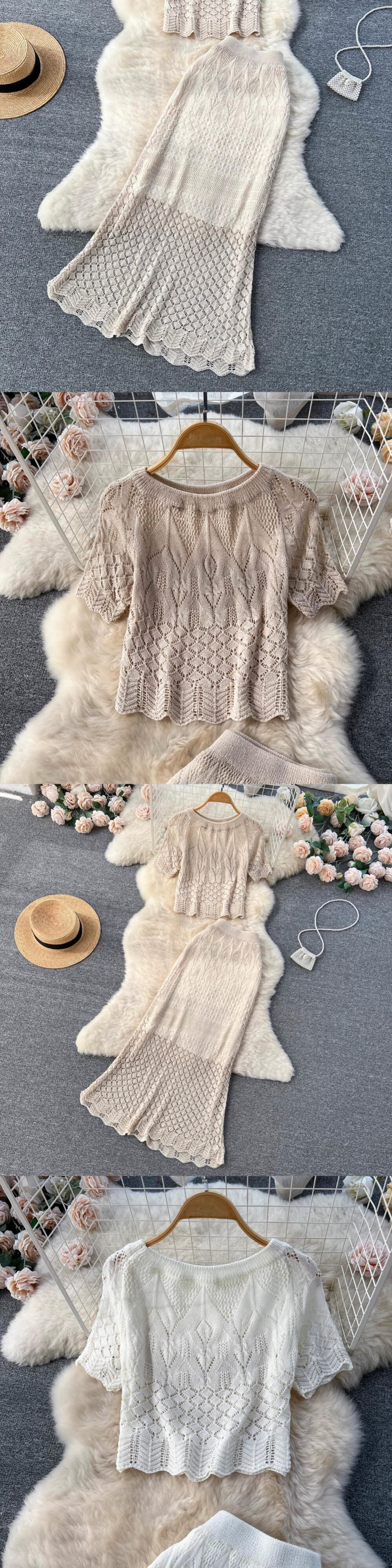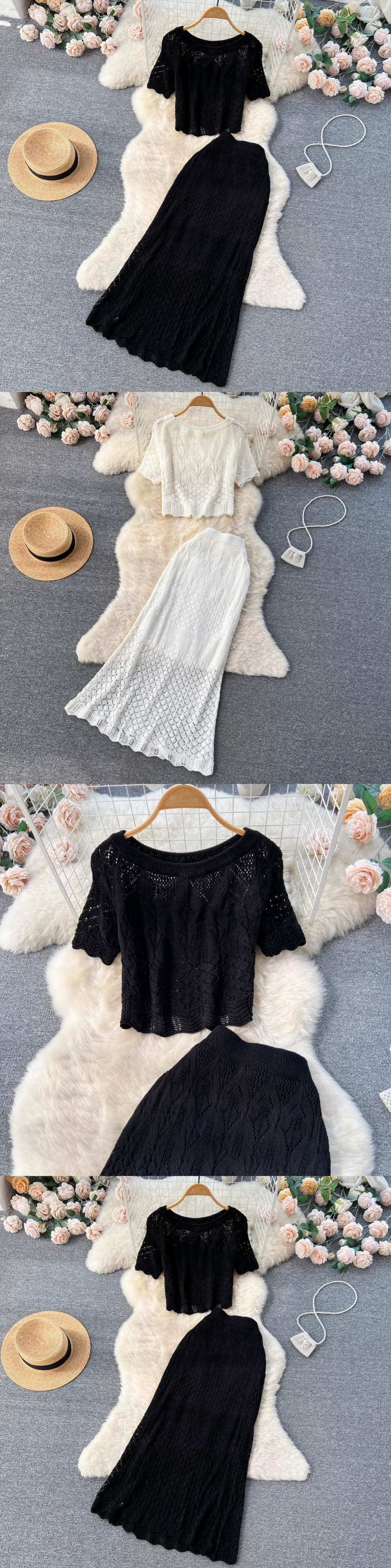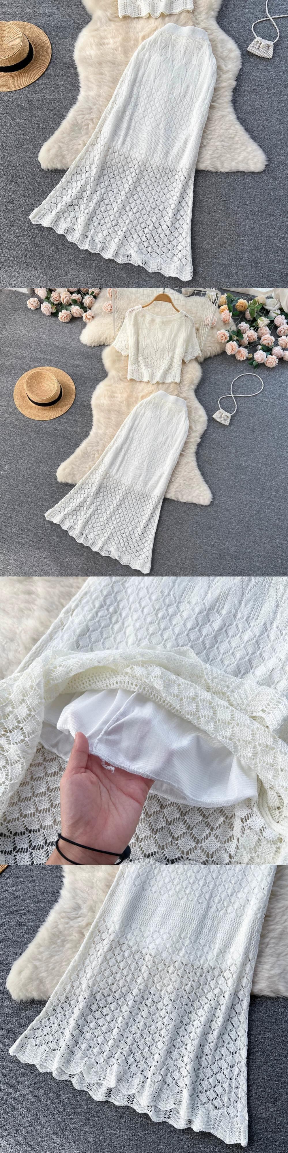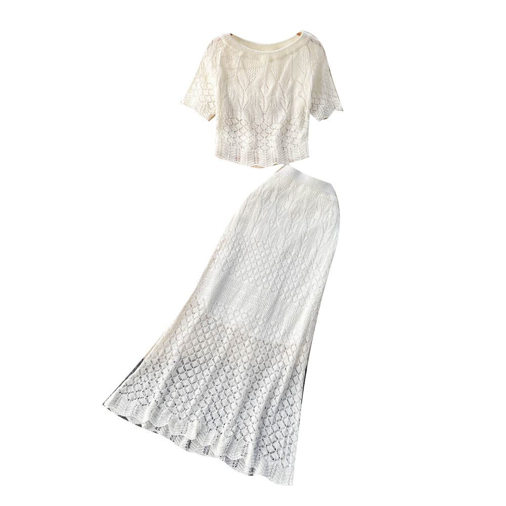 インスタイル中空フックフラワーレース半袖スーツスカートレディースショートトップ+フィッシュテールスカートツーピーストレンディ フラワーデザイン lyxaj86482459150