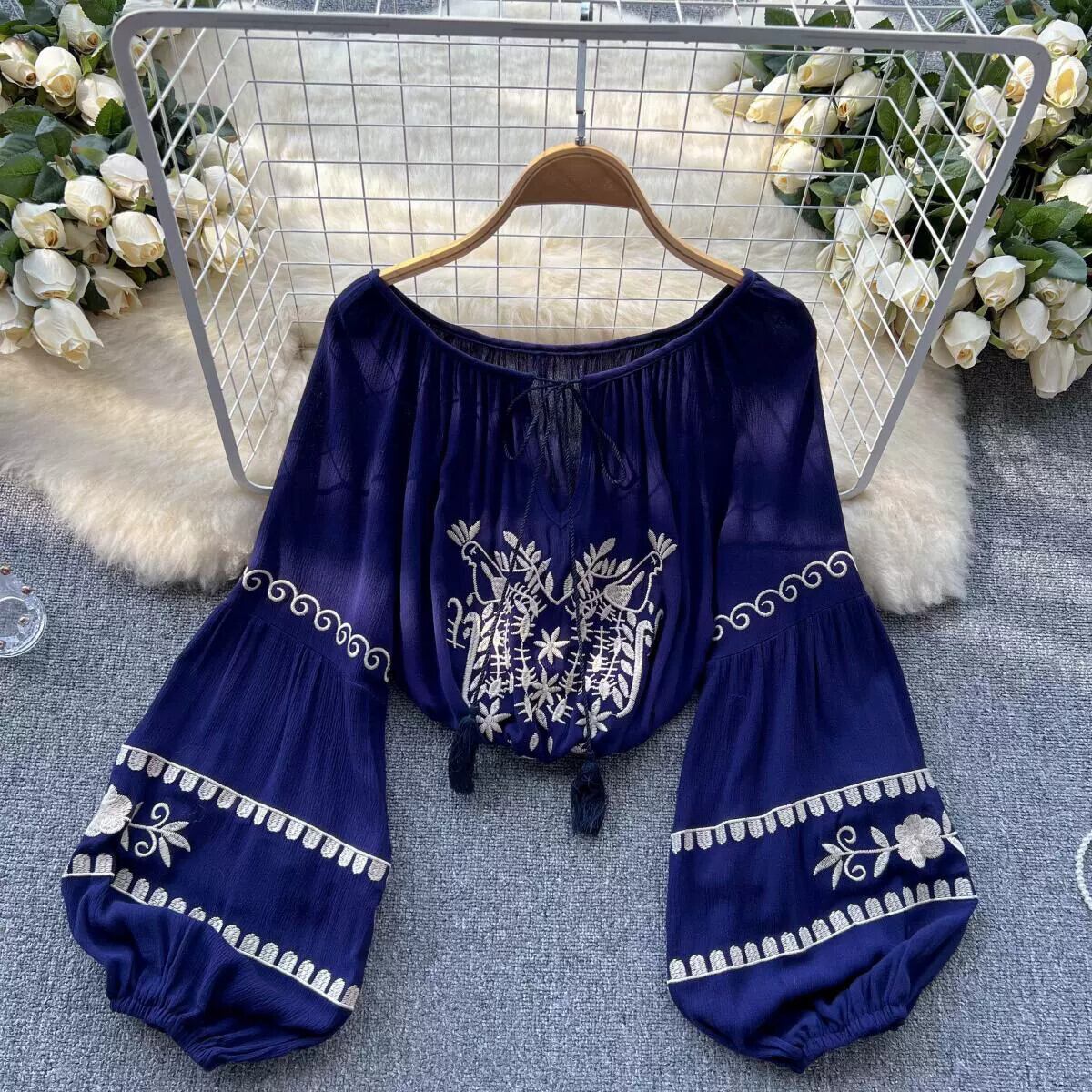 春の西洋スタイルのレトロな刺繍エスニックトップスレディースルーズランタンスリーブプリントシックなシャツ スプリング 春物 lyxaj48154906236