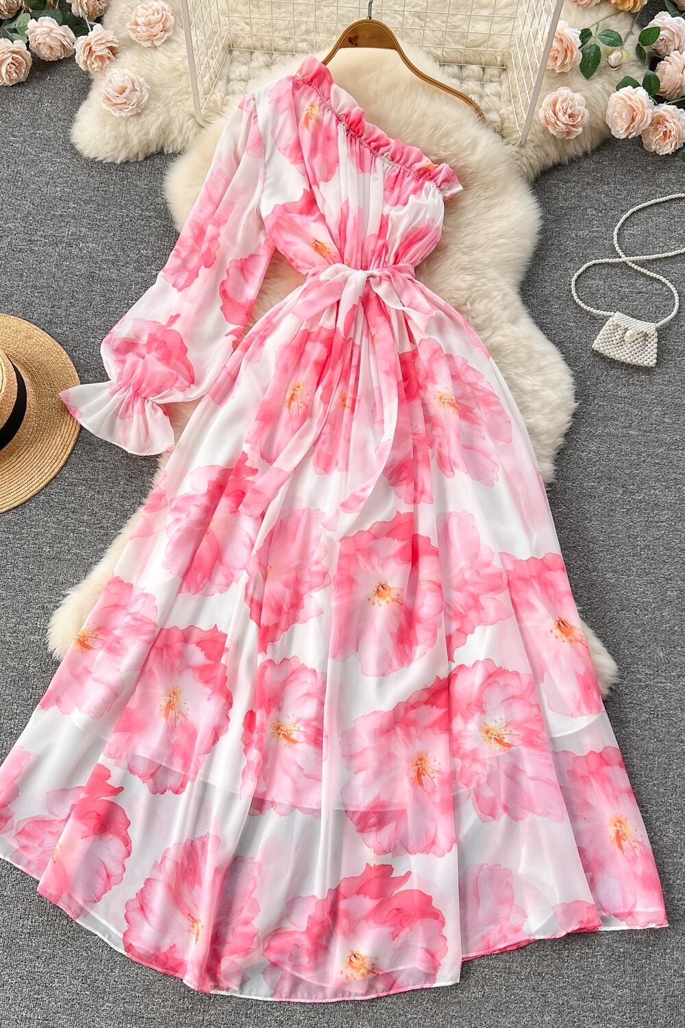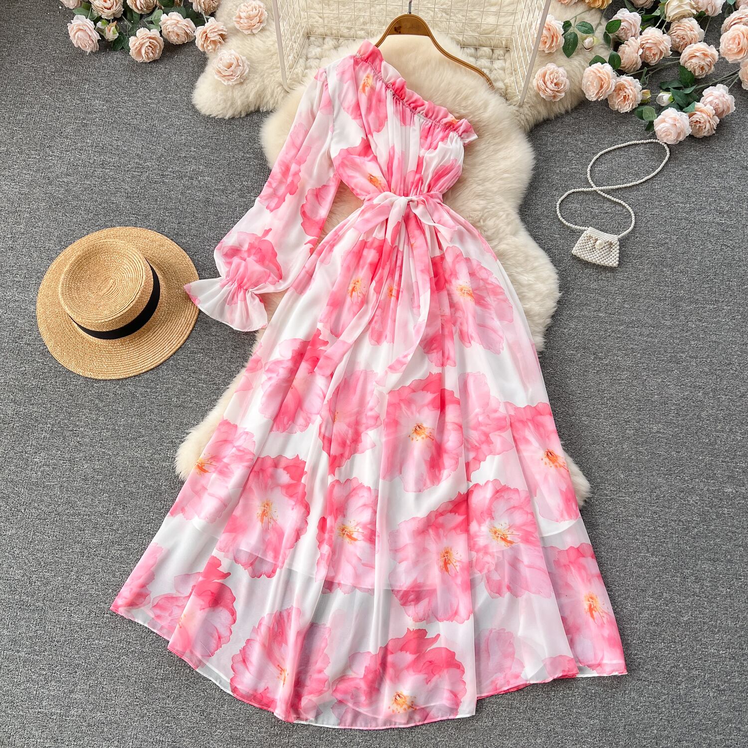 斜め肩パフスリーブシフォンドレスレディースパフスリーブウエストスイング膝上花柄妖精ロングスカート lyxaj10912129513