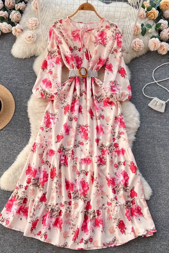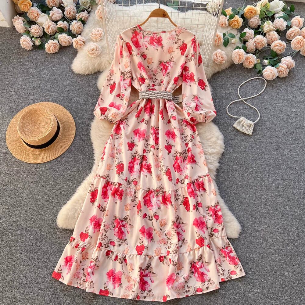 春の新作レースアップパフスリーブウエストプリントドレス女性の初恋の花の気質プリーツ妖精ロングスカート スプリング 春物 花柄 lyxaj28702205642
