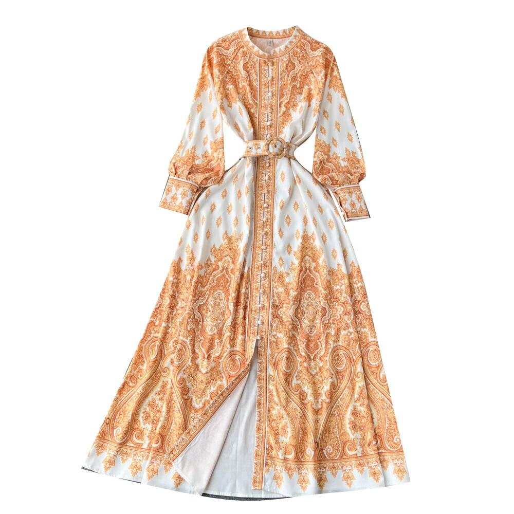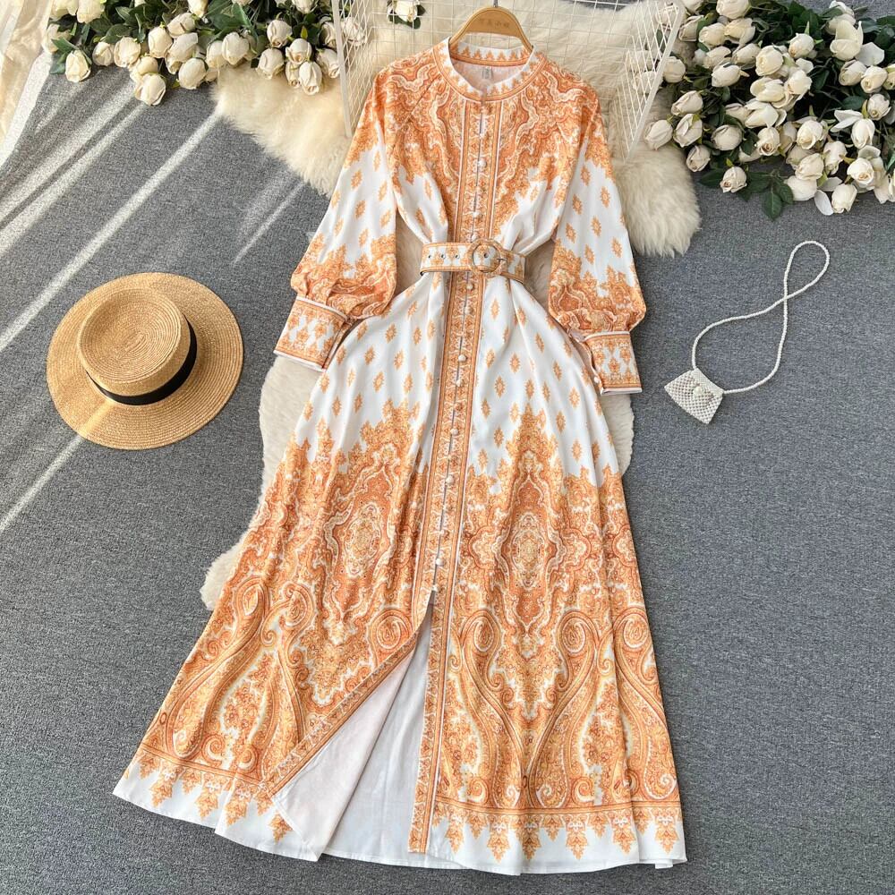 春ドレスコートスタイルスタンドアップカラープリントドレスレディースフレンチレトロ気質スリムウエストシングルブレストロングスカート スプリング 春物 lyxaj36719999445