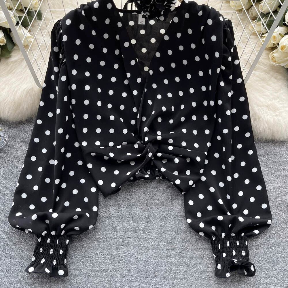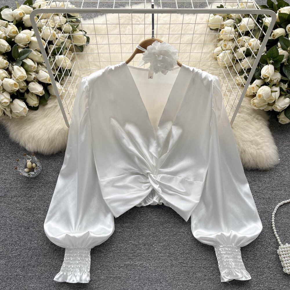 セクシーなスタイルのクロス V ネック パフ スリーブ シャツ フェミニンなオールマッチ シャツ ショート ボトリング シャツ サテン トップ Vネック lyxaj14654539231
