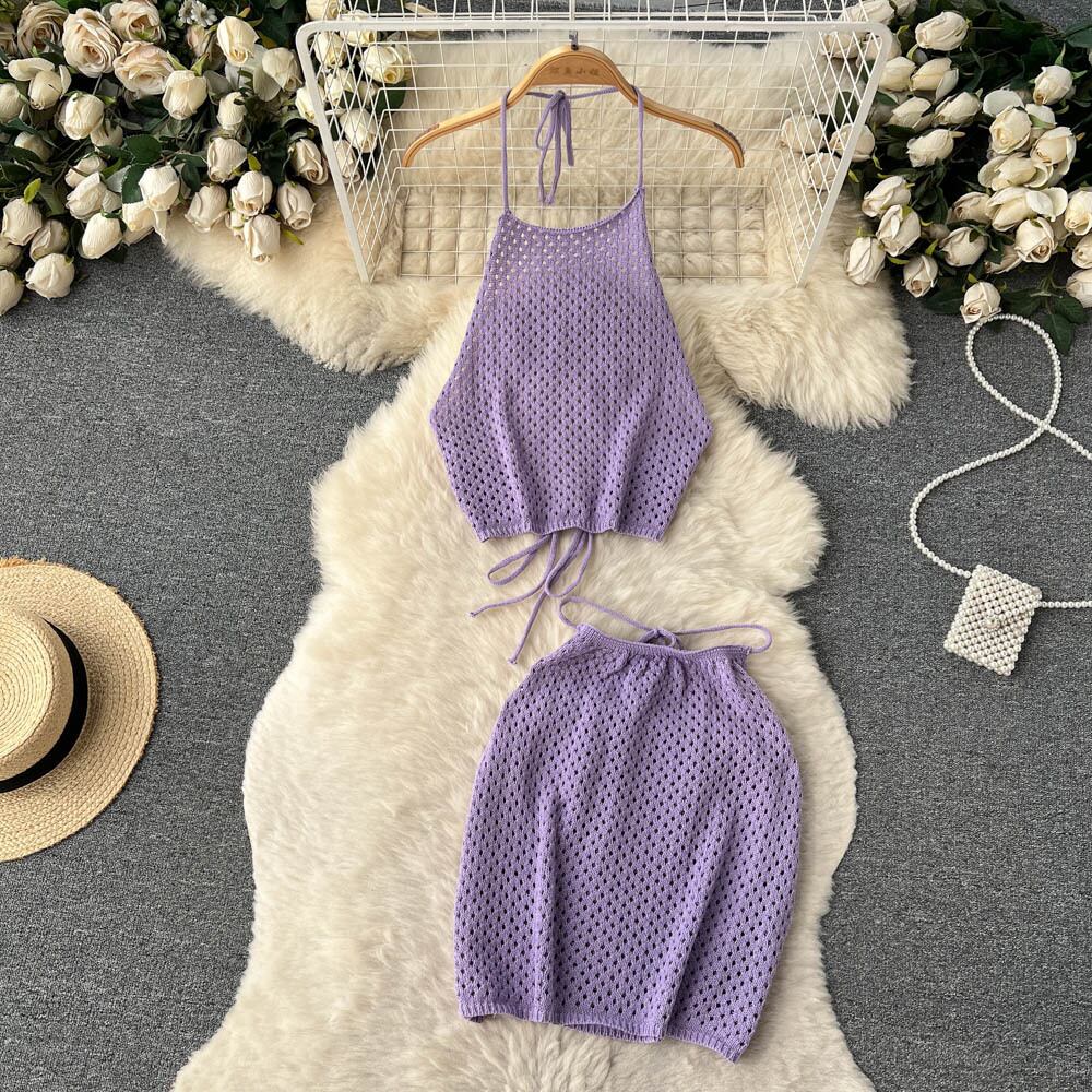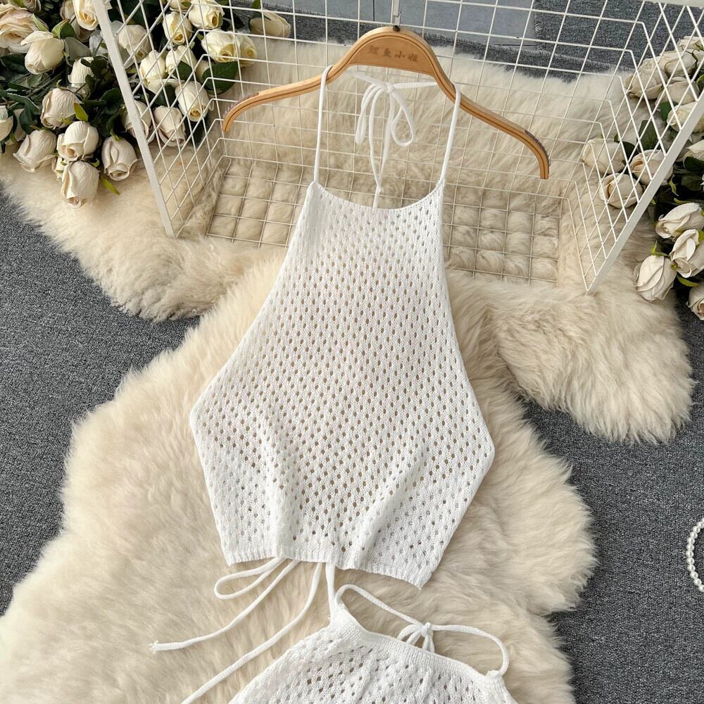 スパイスガールズインスタイルジャカード中空アウトスーツ女性の夏ハンギングネックストラップチューブトップベスト + ヒップスカートツーピーストレンディ サマー 夏物 lyxaj12122014689