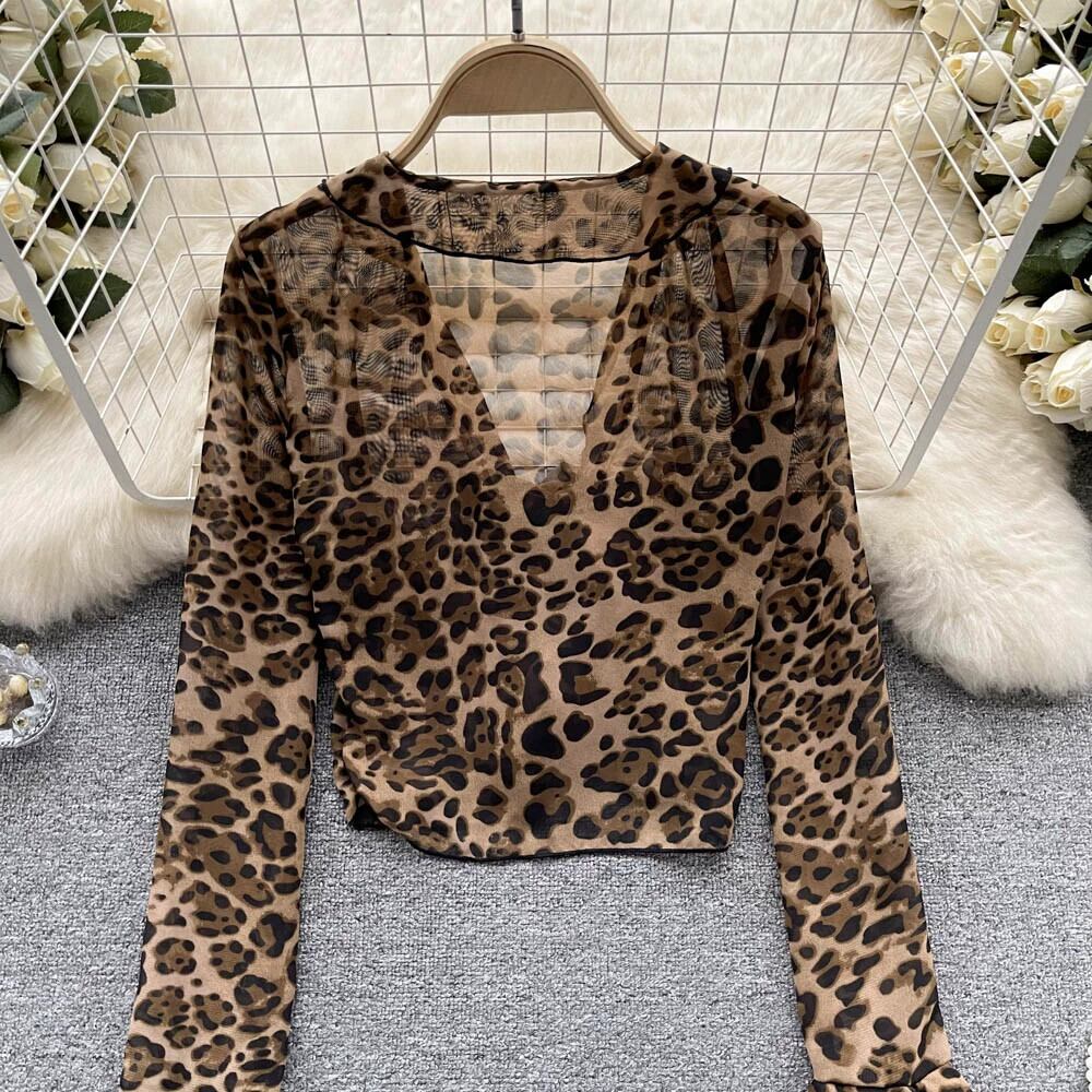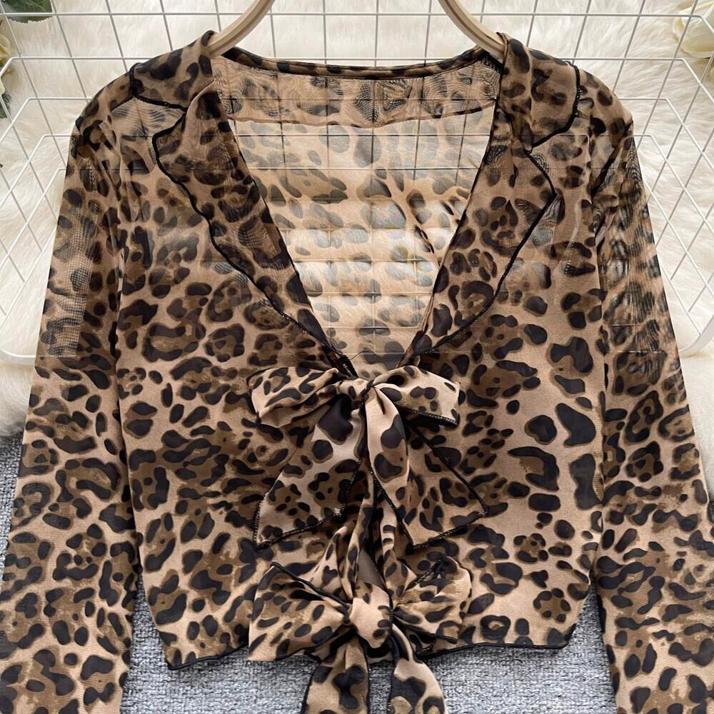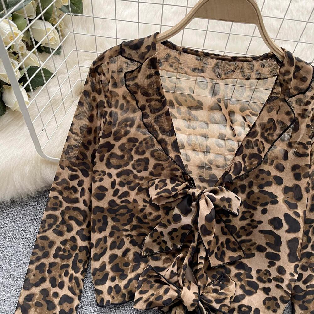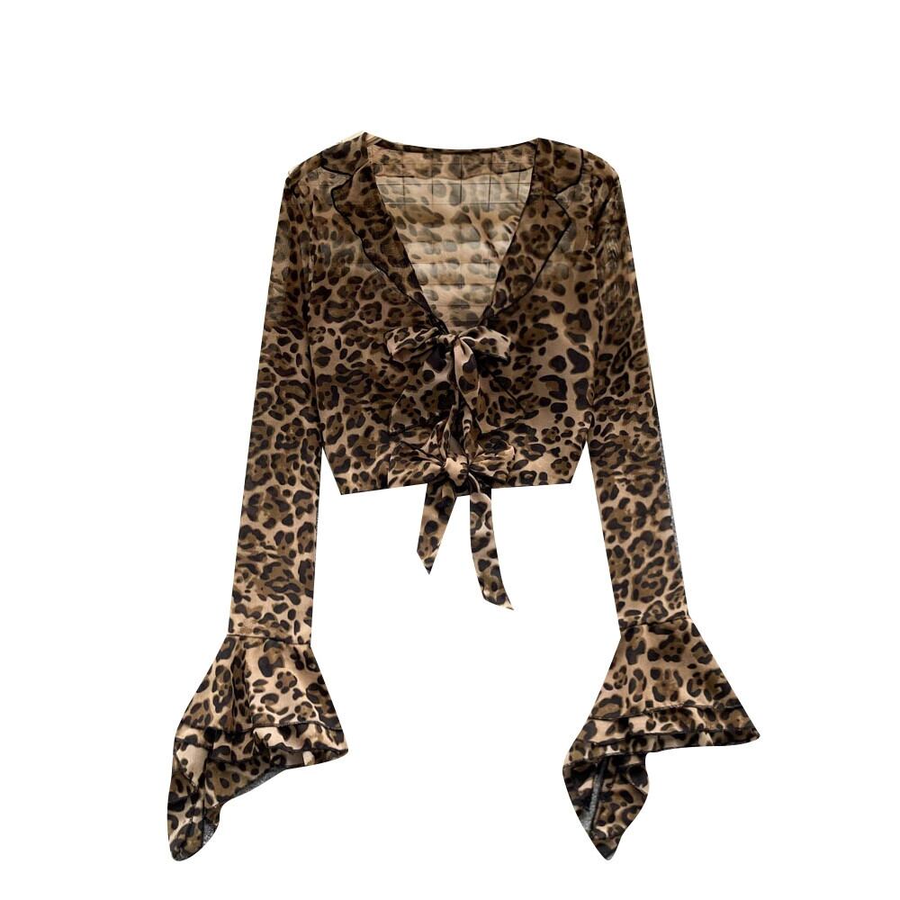 セクシーな純粋な欲望風トップ夏通気性長袖ヒョウトランペットスリーブ高品質シャツショートシフォンシャツ女性 ロング サマー 夏物 ピュア lyxaj61171687289