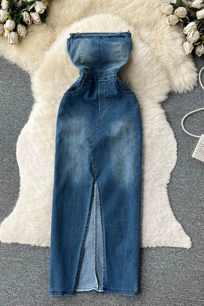 ワンショルダー チューブ トップ デニム ドレス レディース 春と夏の気質ウエスト ウエスト セクシー スリット レトロ スタイル バッグ ヒップ スカート トレンディ スプリング 春物 サマー 夏物 lyxaj21407665272