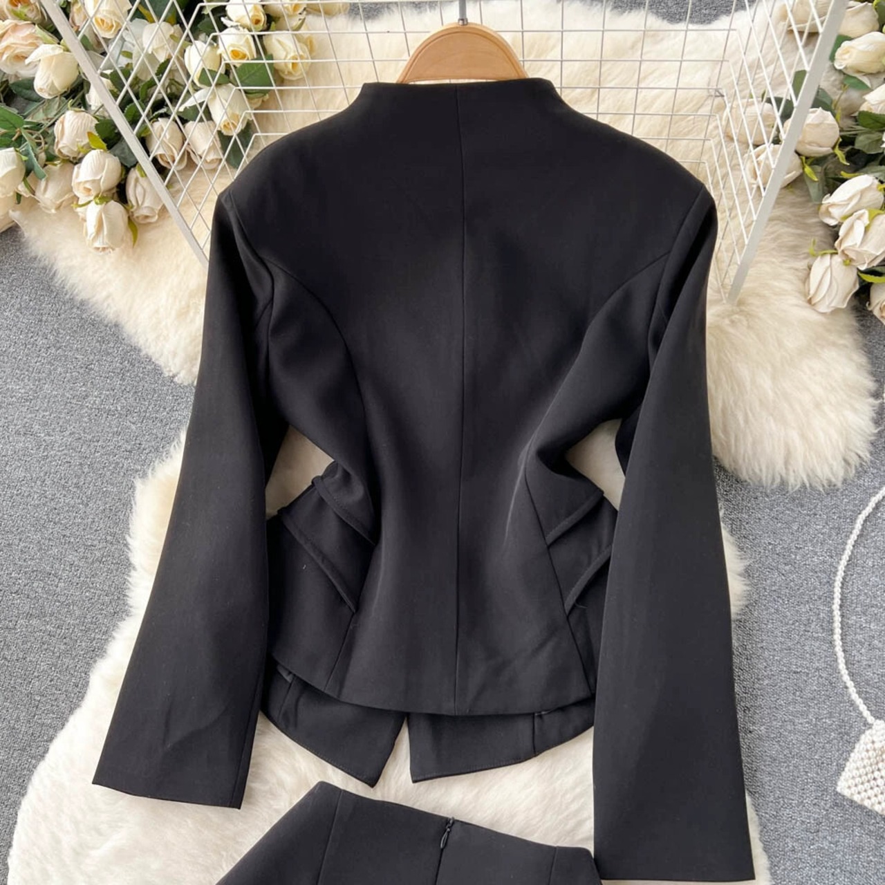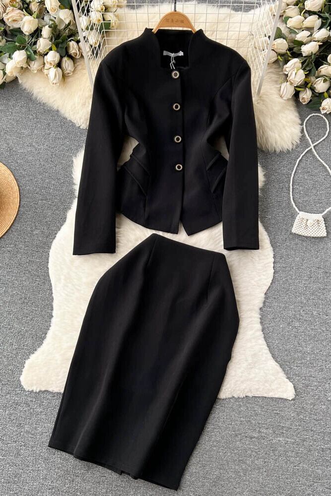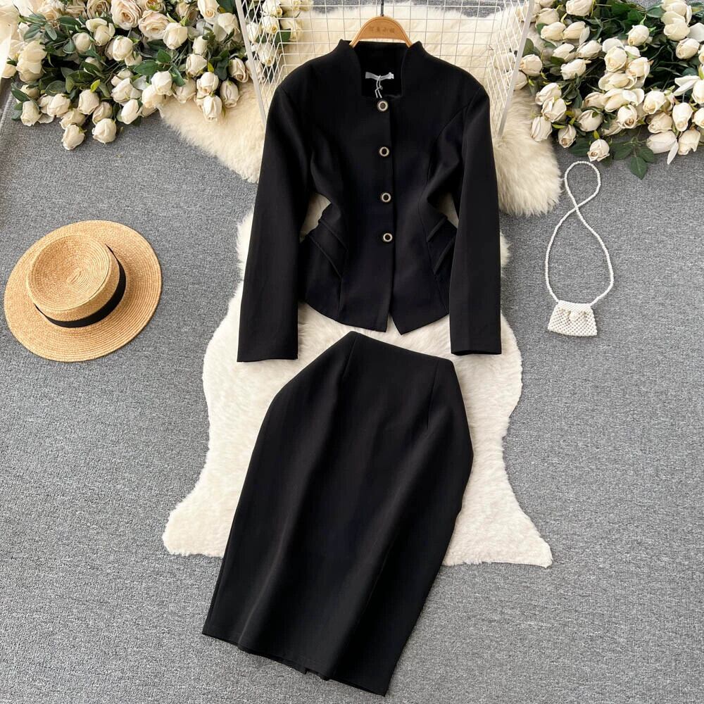 2023春と秋の新作ドレスヘボンスタイルスーツスカートレディースシングルブレスト長袖ジャケット+ヒップスカート2点セット ロング スプリング 春物 オータム 秋物 lyxaj18208796313