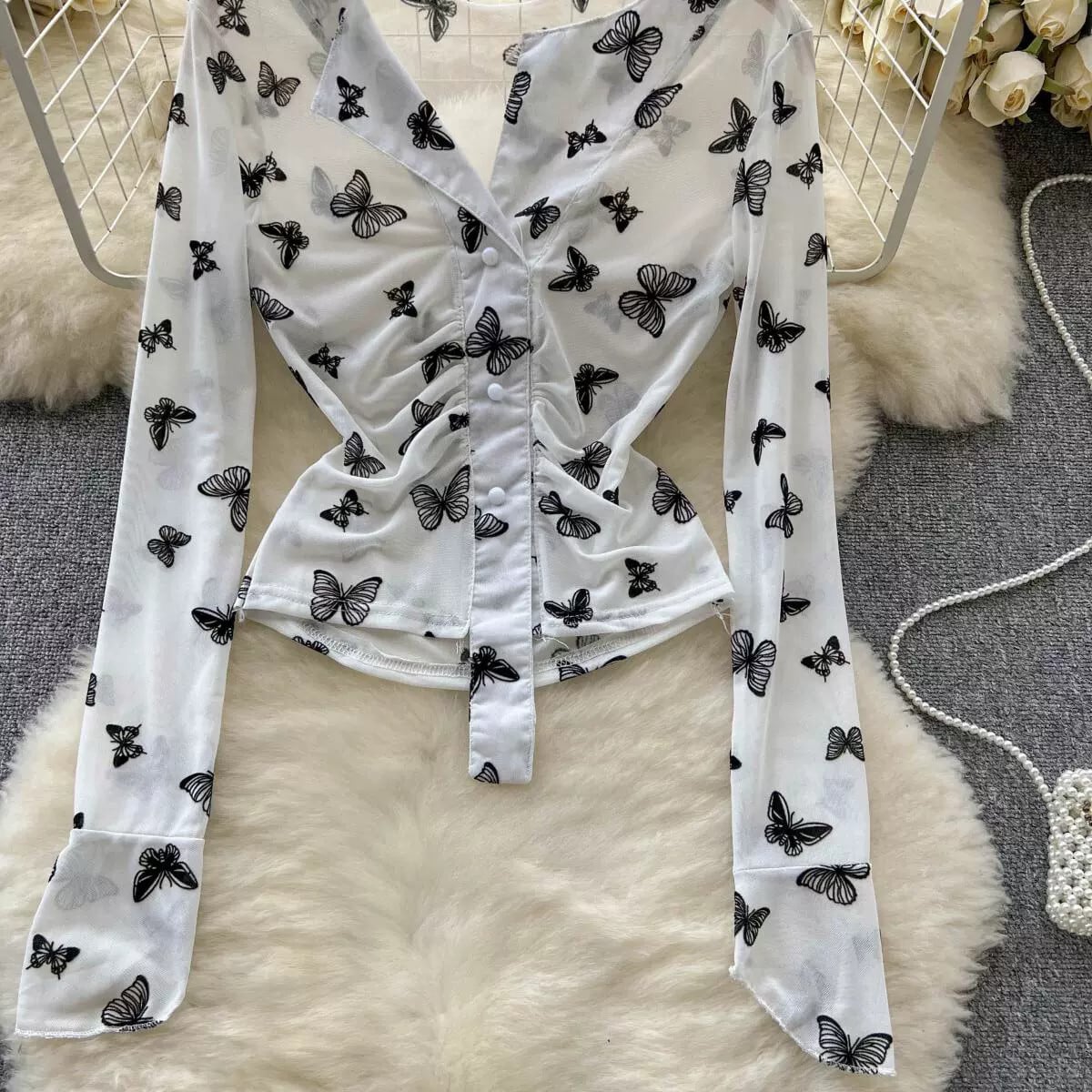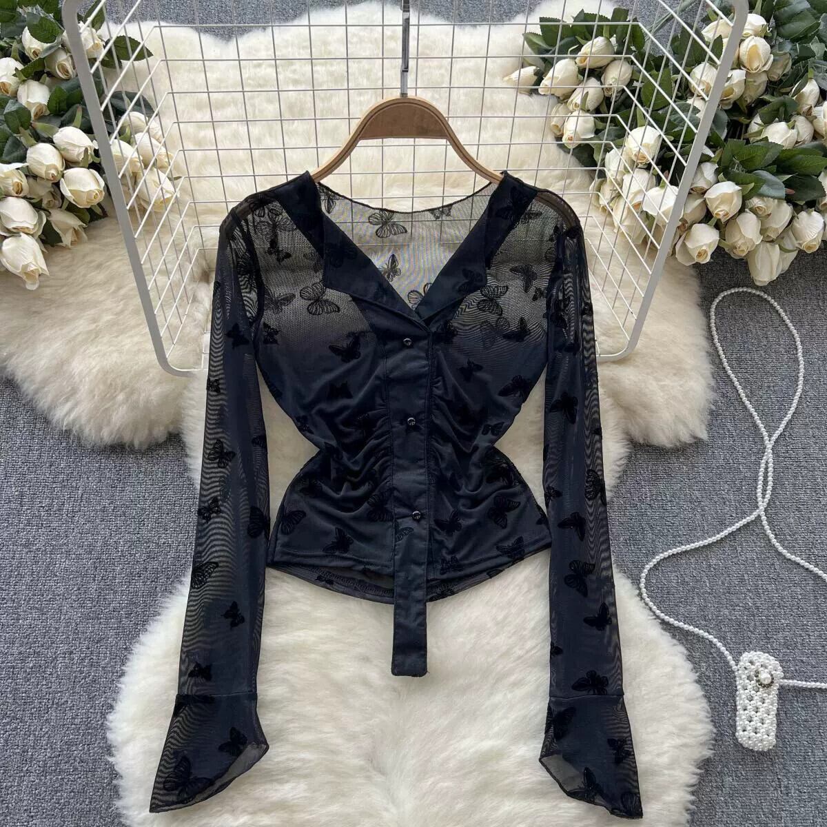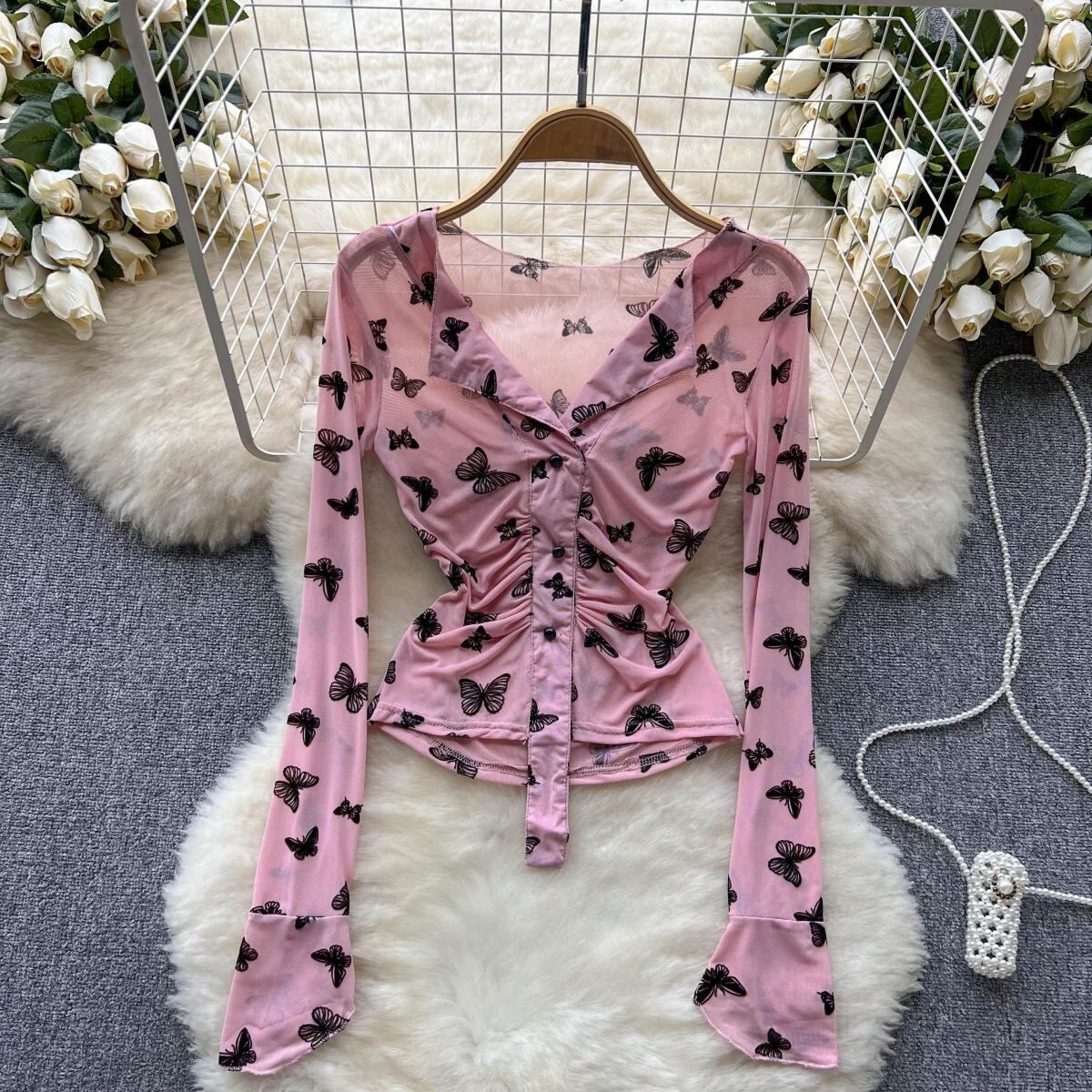 純粋な欲望風甘いデザインセンスバタフライプリントインナーボトムシャツレディース V ネックプリーツレトロスリムトップトレンディ 大人ガーリー スウィート キュート カジュアル Vネック lyxaj45110917039