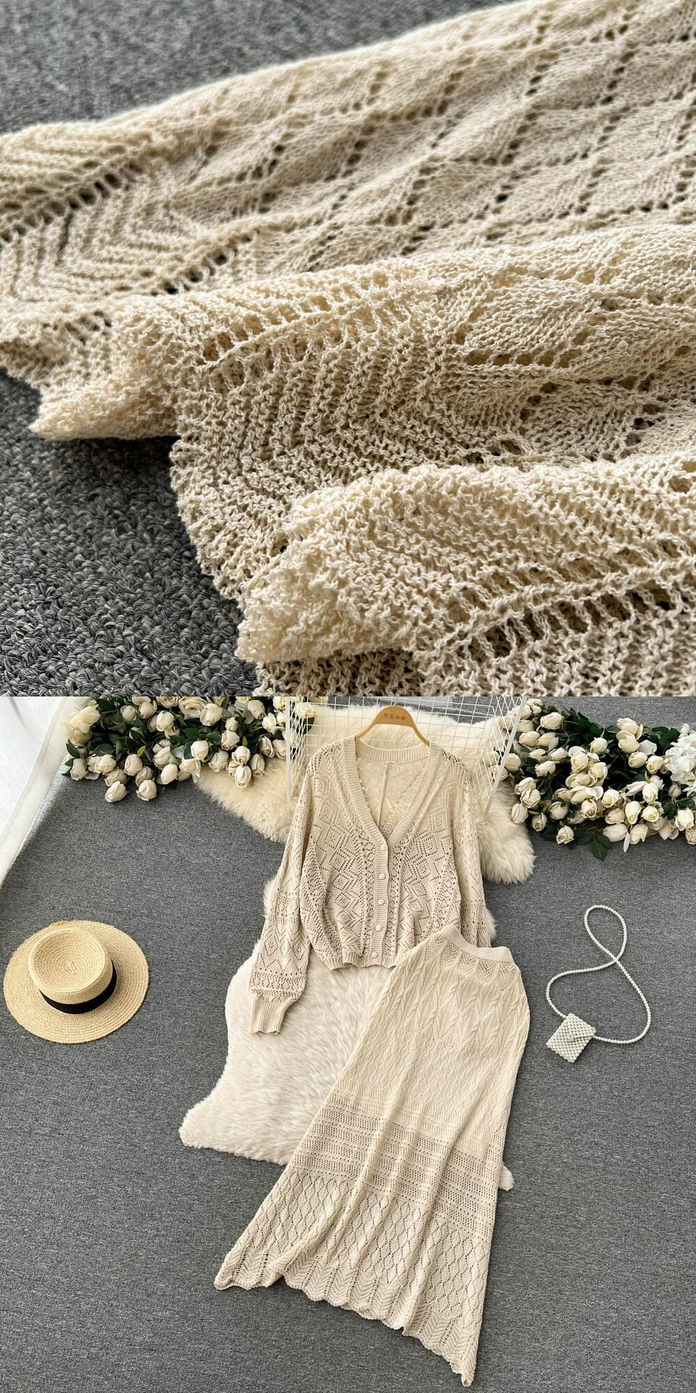 スタイル中空ニットスーツの女性の長袖 V ネックルーズトップ + ミッドレングスのフィッシュテールバッグヒップスカート 2 点セット ロング Vネック lyxaj81290290395