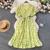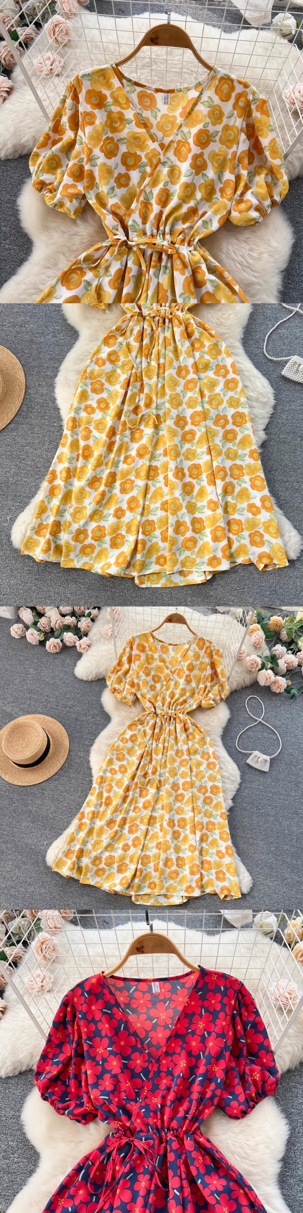 小さな新鮮な花柄シフォンドレスレディース夏半袖Vネック気質スリムウエストと膝丈Aラインロングスカート サマー 夏物 lyxaj16607572311