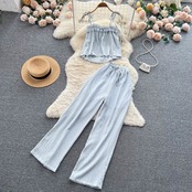 夏シフォンスーツ女性の木耳サイドストラップショートトップウエストドレープストレートレッグワイドレッグパンツ 2 点セット サマー 夏物 ワイドパンツ lyxaj2091823921
