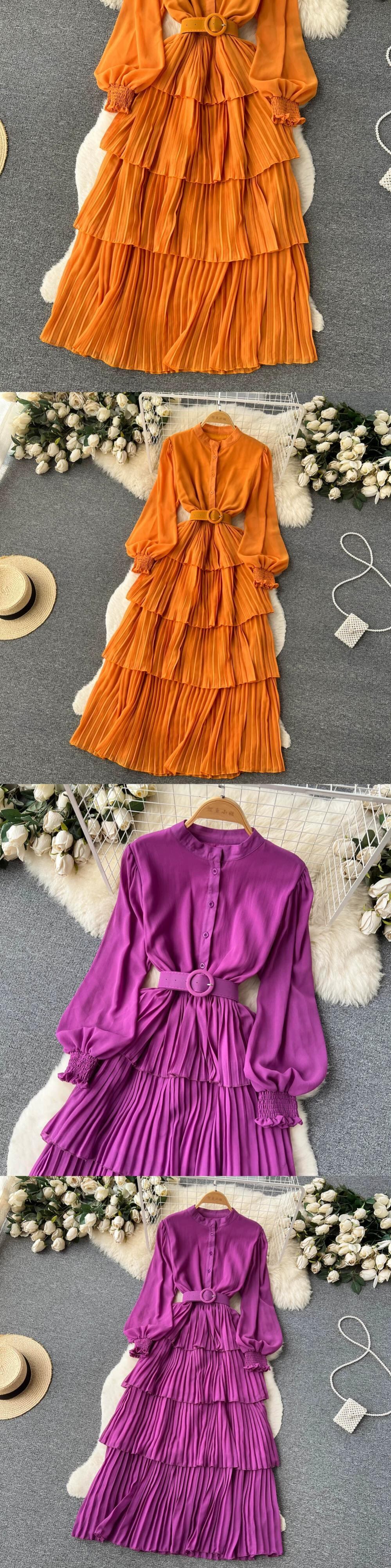 2023 春と秋の新ビッグスイング長袖シフォンドレス女性のウエスト気質キキョウティーブレイクケーキロングスカートトレンディ スプリング 春物 オータム 秋物 lyxaj45764654297