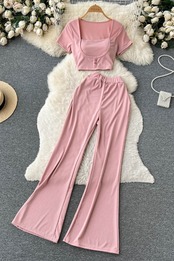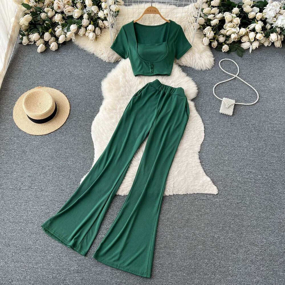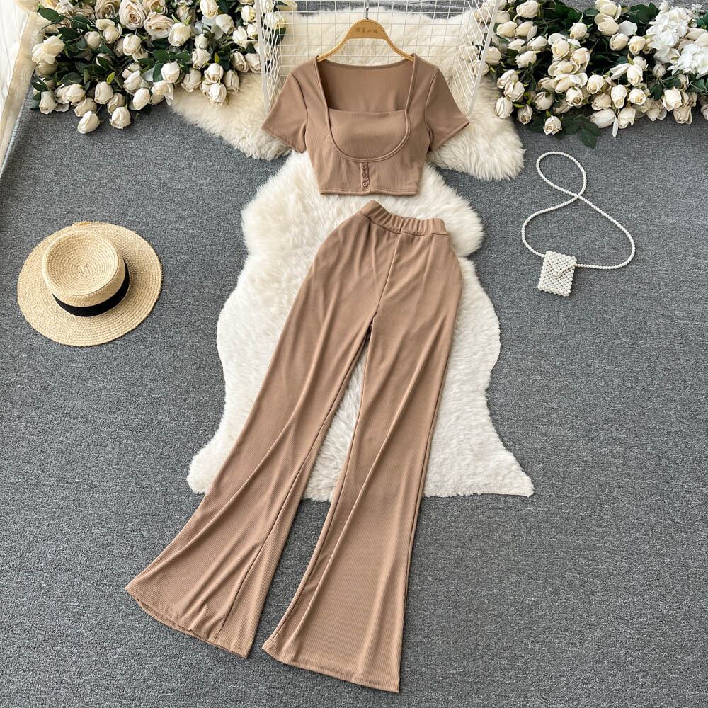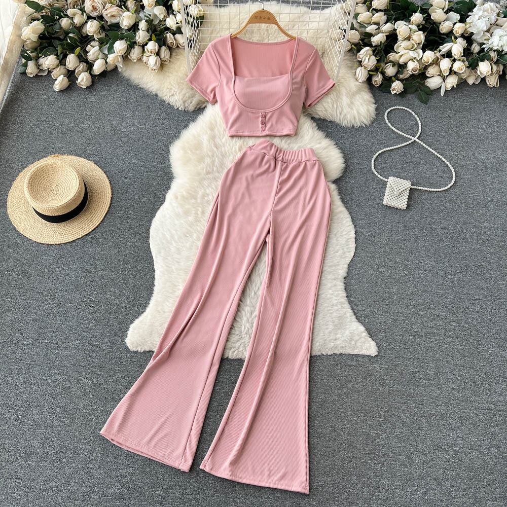 夏のファッション無地セクシーなスクエアカラーショートトップ胸パッドドレープハイウエストわずかにフレアワイドレッグパンツツーピーススーツ ハイウェスト レッド サマー 夏物 ソリッドカラー スクウェア lyxaj51420478618