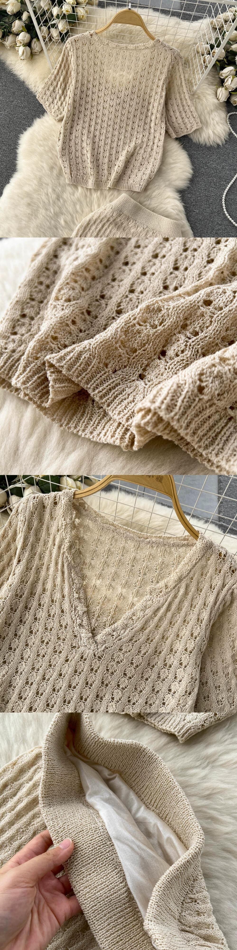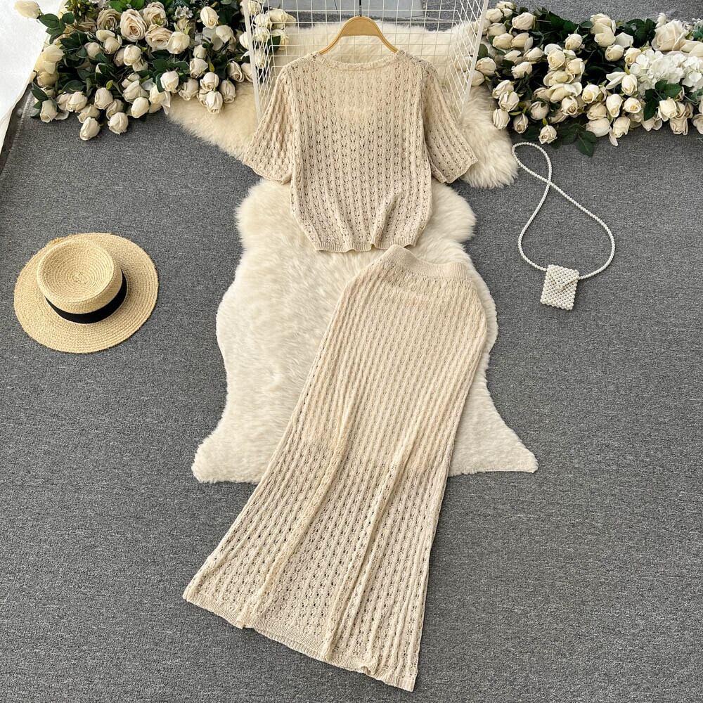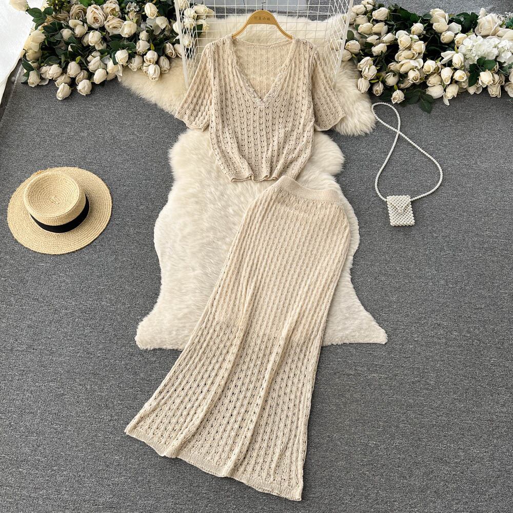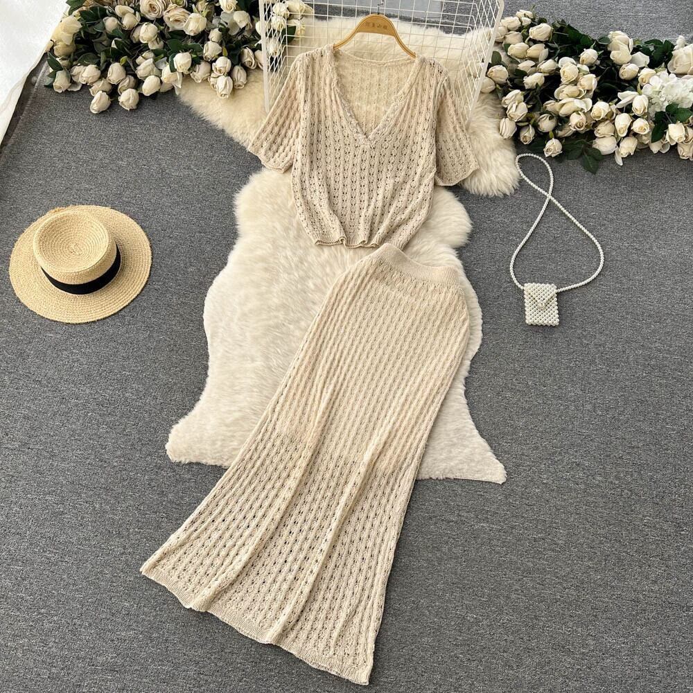 夏のセレブスタイルの小さな香りの気質Vネックルーズトップ+ハイウエストフィッシュテールスカートニットツーピーススーツ ハイウェスト サマー 夏物 lyxaj91653208558