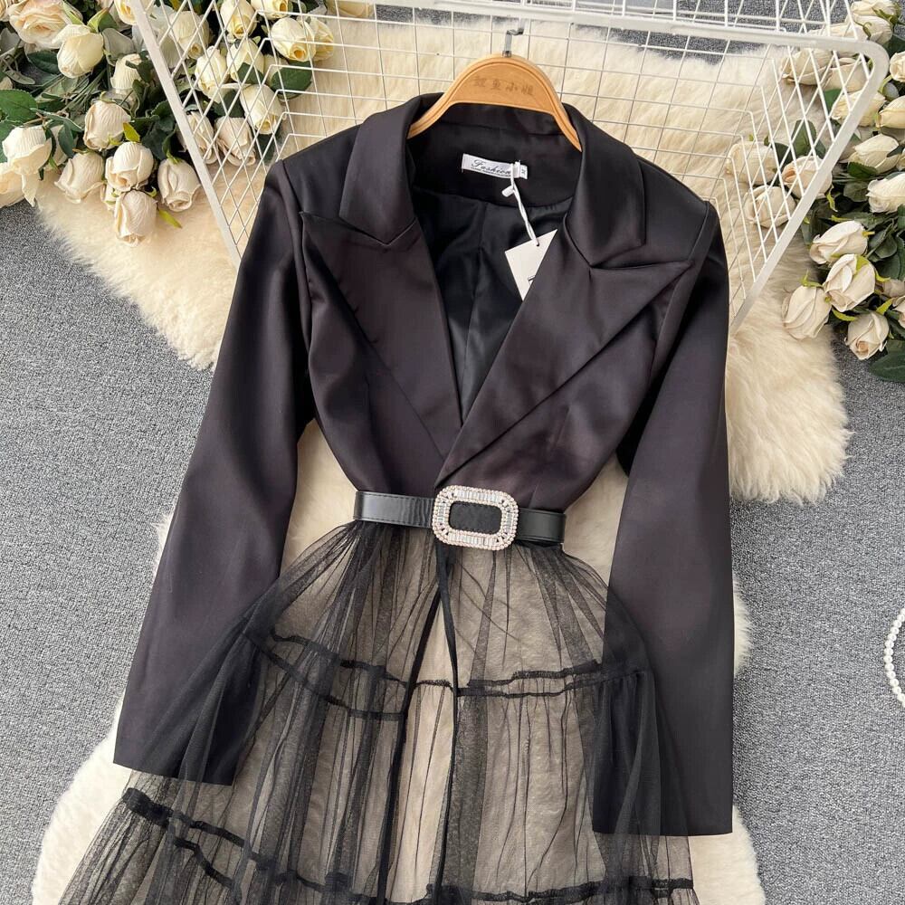 春と秋の新しいティーブレイクフレンチドレス女性セレブ気質長袖Vネックスプライシングメッシュシフォン妖精ドレス ロング スプリング 春物 オータム 秋物 lyxaj39988939926