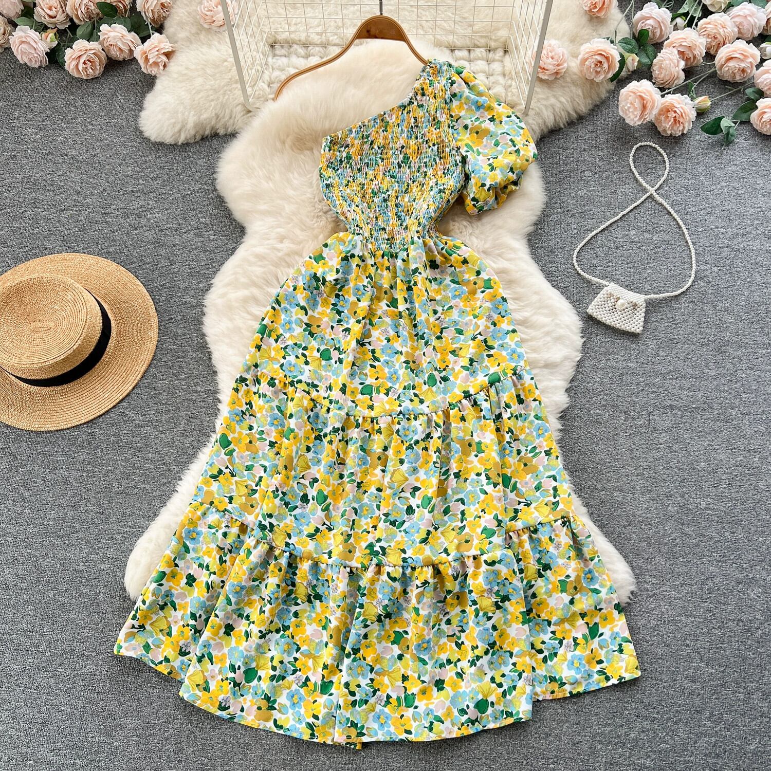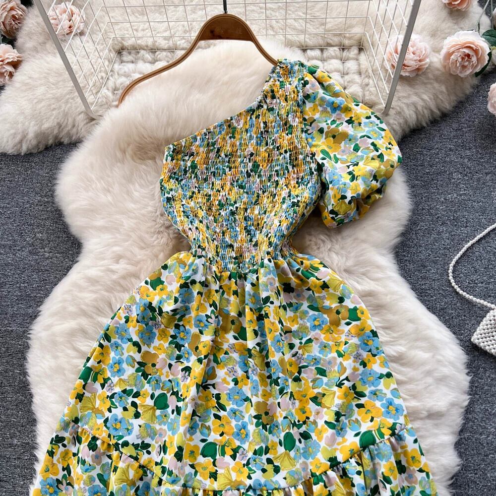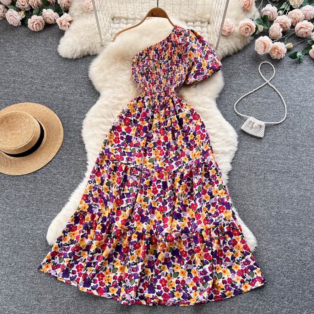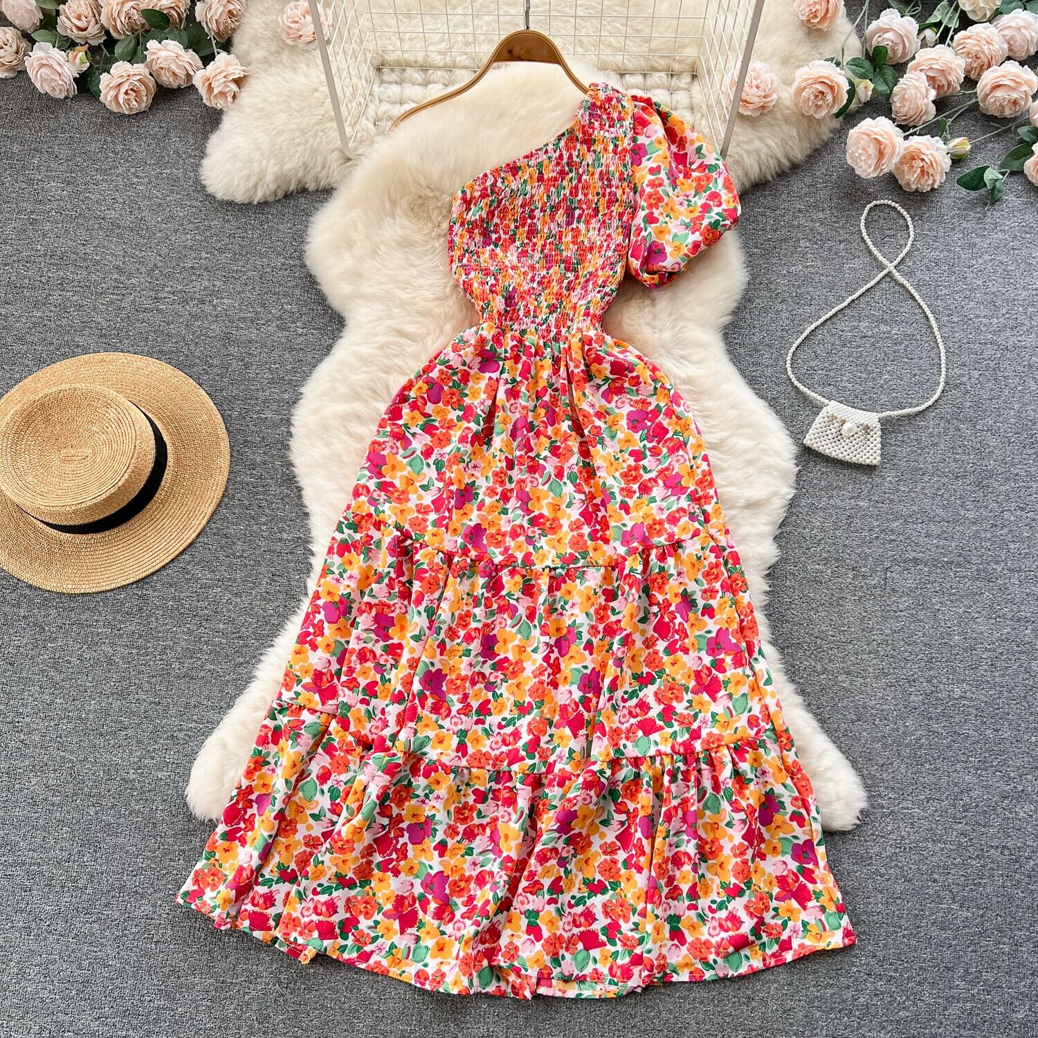 センス片袖斜めショルダードレス女性のワンネックチューブトップ大きなスイング花柄レトロハイウエスト妖精プリーツドレス ハイウェスト lyxaj98283194917