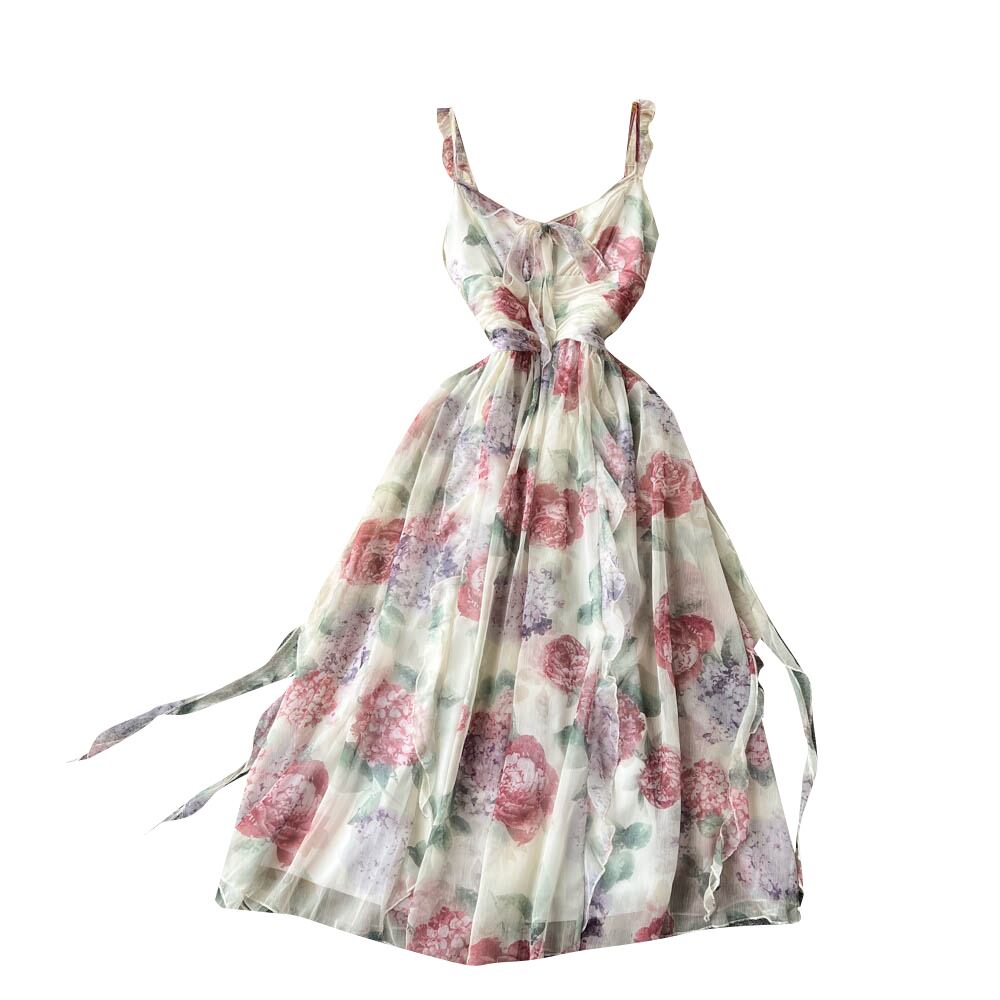 キキョウ科フランススーパー妖精ネットガーゼネクタイ妖精スカートウエスト花木耳サスペンダー V ネックドレス女性の夏 レース サマー 夏物 花柄 Vネック lyxaj87403560678