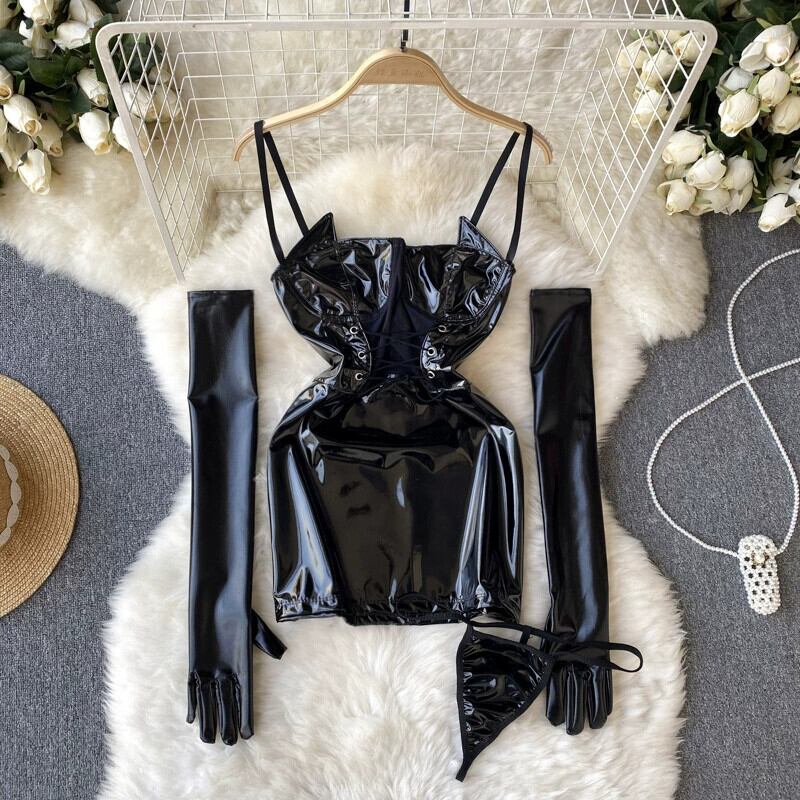 春と夏のデザインセンスセクシーな PU レザーサテンスリングチューブトップドレス女性の背中の開いたリトルブラックドレスと袖 スプリング 春物 サマー 夏物 lyxaj8482861874