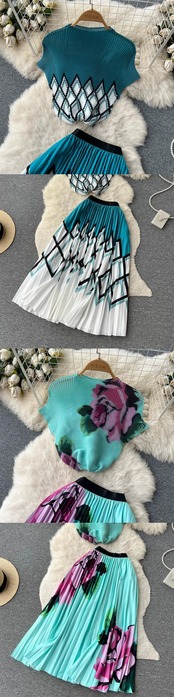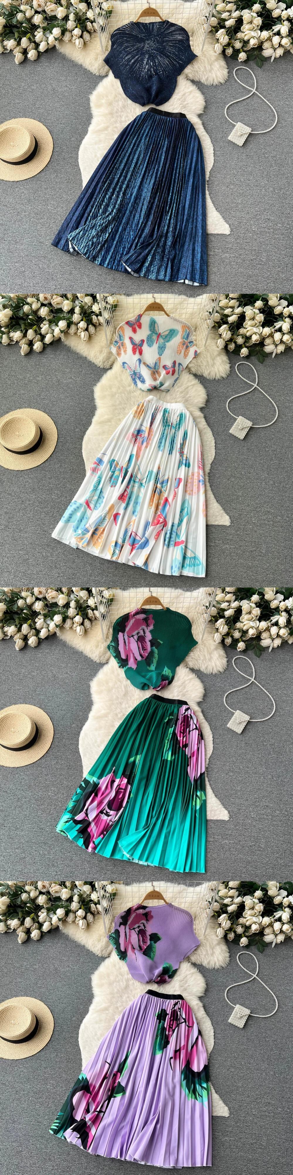 夏の新作プリントスーツレディースバケーションスタイルルーズトップ+優しい気質プリーツAラインスカート2点セット サマー 夏物 lyxaj24464603855