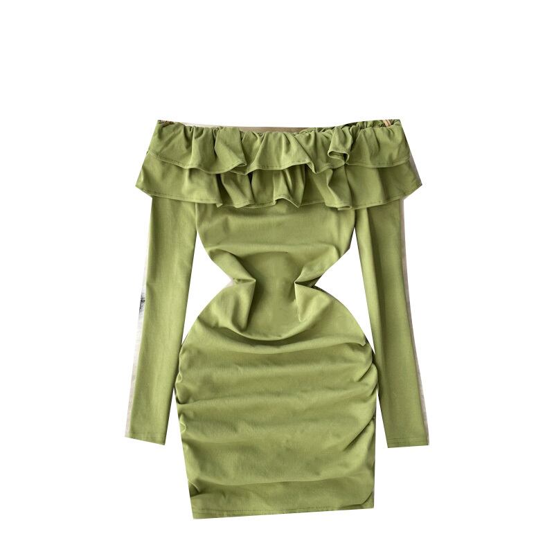 2023 春と秋のスタイルスパイスガールズセクシーなワンラインネックミッドレングスプリーツ長袖スリムフィットと気質パッケージヒップドレス ロング スプリング 春物 オータム 秋物 lyxaj33860149936