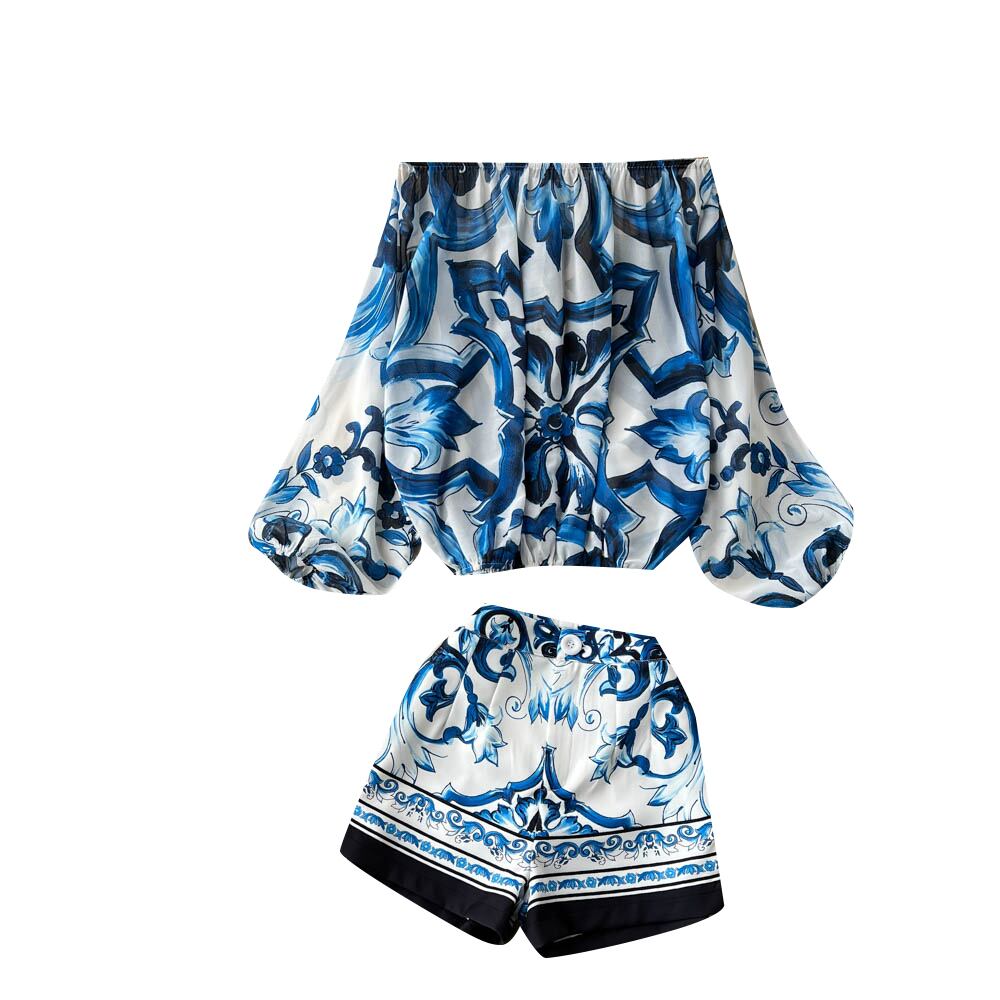 欧米ファッションプリント洋風スーツレディースランタン袖一言襟プリントシャツハイウエストワイドレッグショーツ2点セット ハイウェスト ランタンスリーブ ブルマー ヨーロピアン lyxaj55813095319