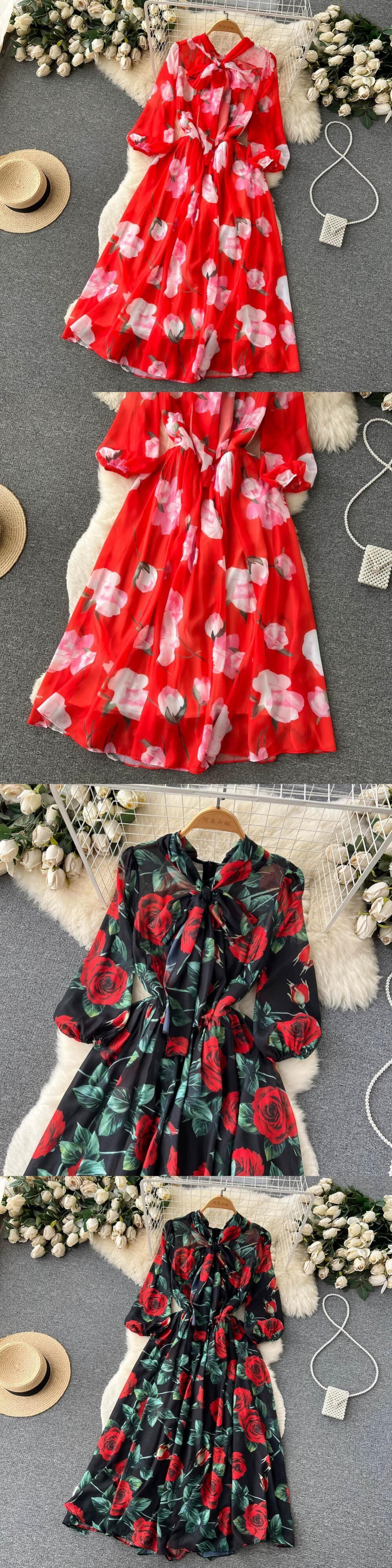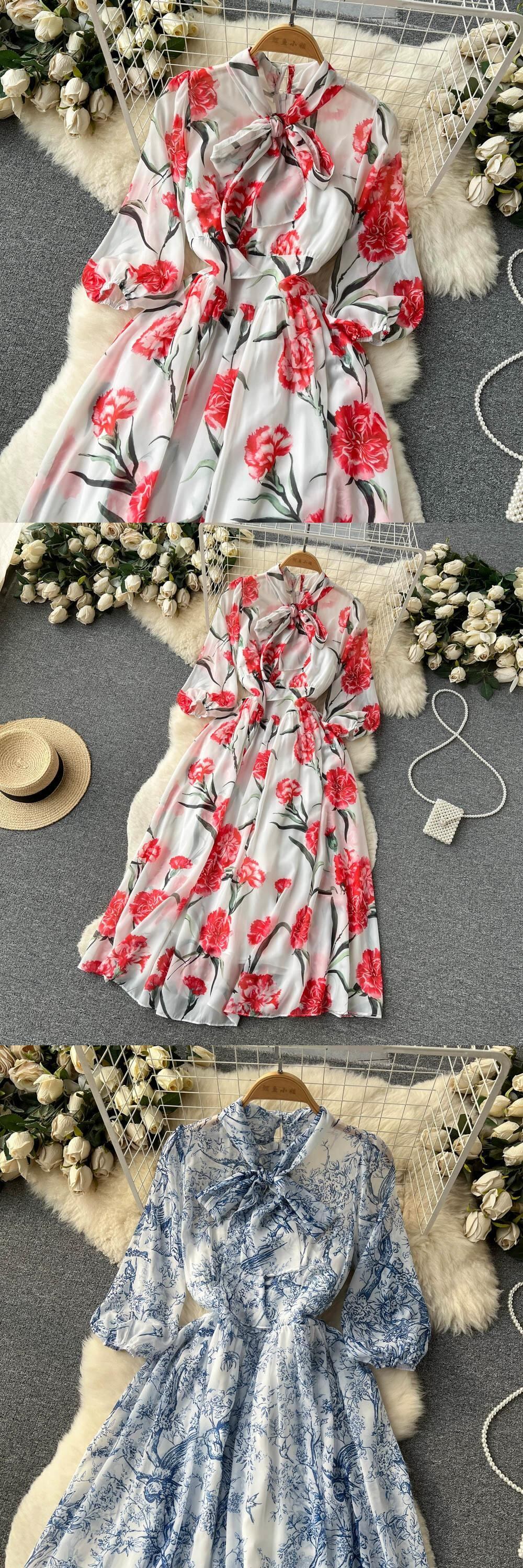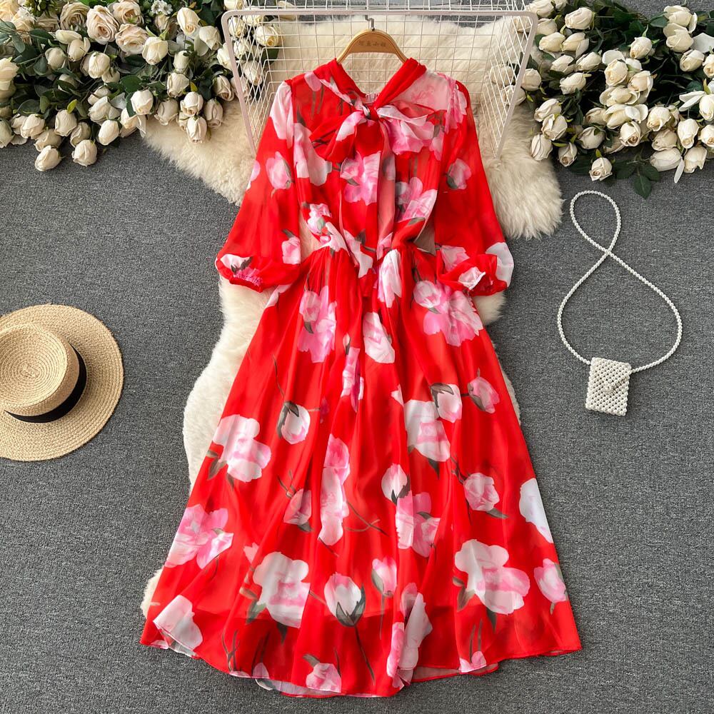 春と夏の花柄ドレス女性 2023 新しいフランスの気質セレブハイエンド蝶結びロングスカートトレンディな リボン スプリング 春物 サマー 夏物 lyxaj29085902581